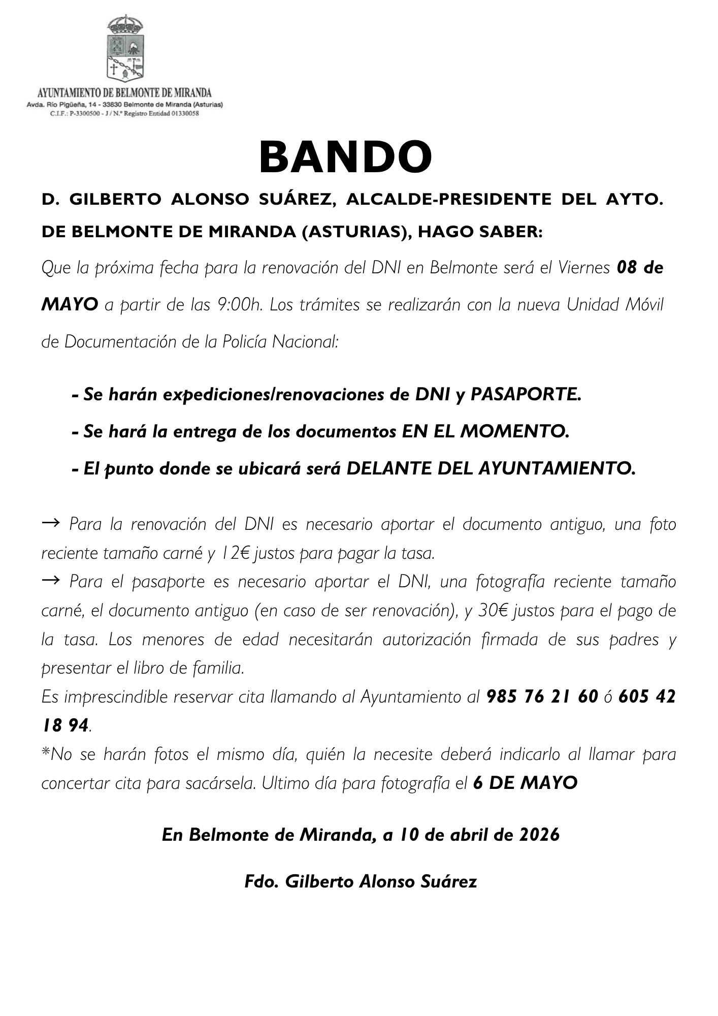 Se informa a la ciudadanía que habrá expedición de DNI y pasaporte en Belmonte de Miranda.