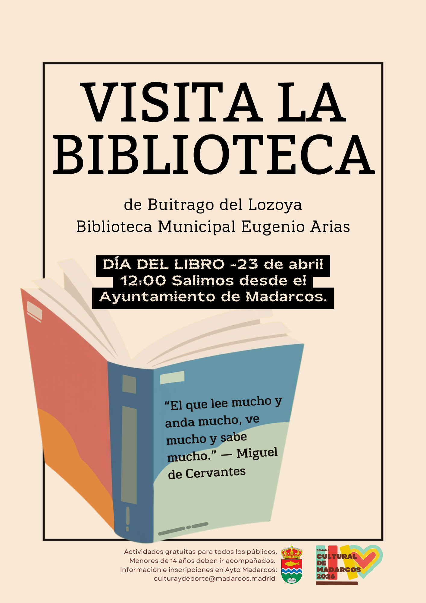 Nos encontraremos en el Ayuntamiento de Madarcos para trasladarnos en grupo a la biblioteca. Lleva tu documento de identidad si necesitas solicitar el carné de la biblioteca.