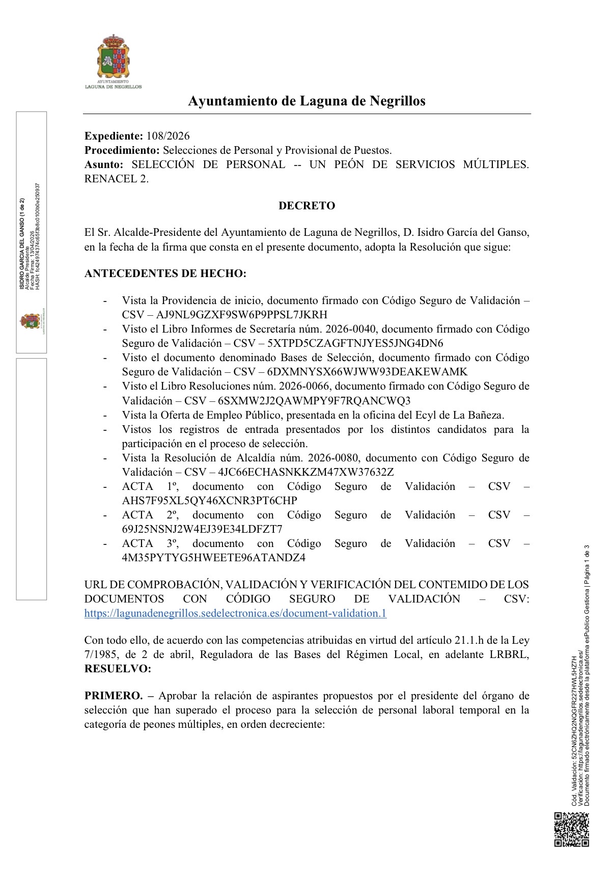 Resolución del proceso de selección de 2 peones de servicios múltiples uno con cargo financiero a la subvención PLANIEL 2026 y otro con cargo financiero a la subvención RENACEL 2026.