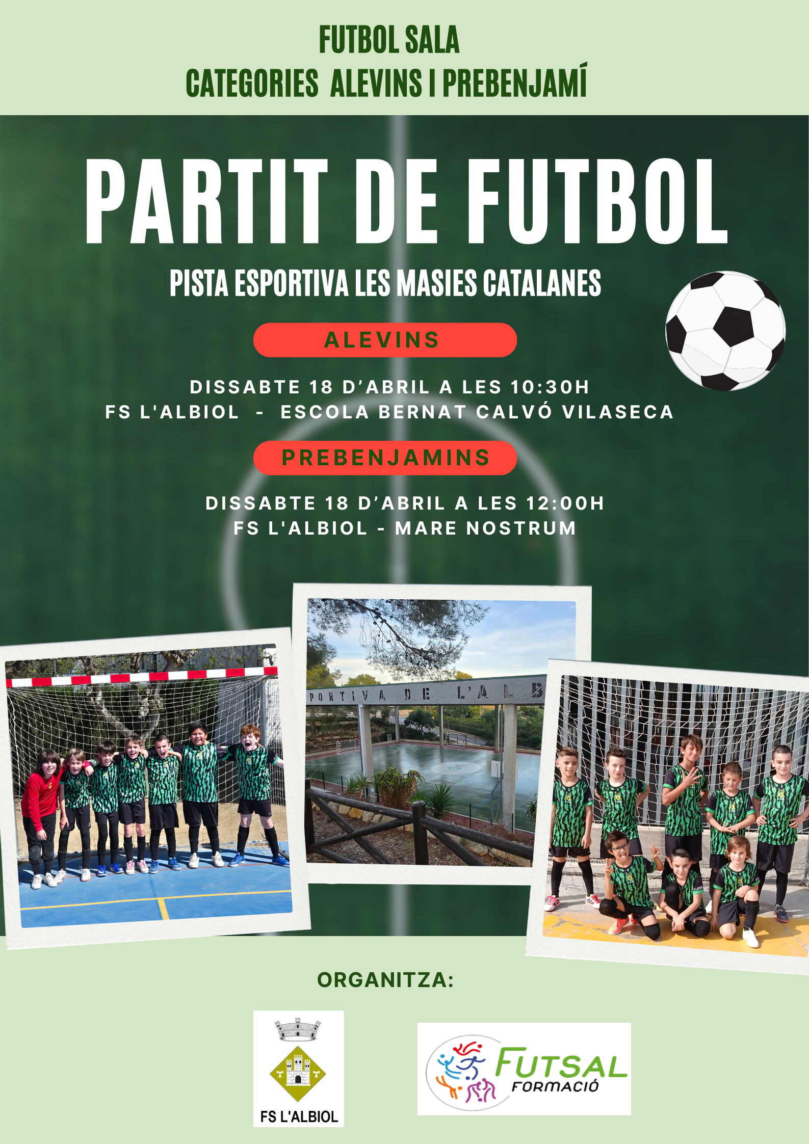 ⚽⚽⚽ La pista esportiva de les Masies Catalanes acollirà aquest dissabte una matinal de futbol sala amb protagonisme per als equips base del FS l’Albiol. Els partits començaran amb la categoria aleví, que s’enfrontarà a l’Escola Bernat Calvó de Vila-seca a les 10.30 h, i continuaran amb el duel dels prebenjamins davant el Mare Nostrum a les 12.00 h.