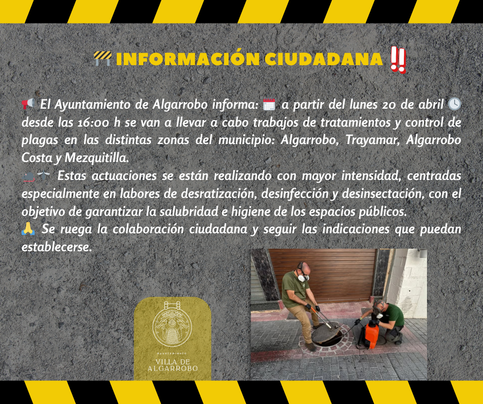 📢 El Ayuntamiento de Algarrobo informa: 🗓️ a partir del lunes 20 de abril 🕓 desde las 16:00 h se van a llevar a cabo trabajos de tratamientos y control de plagas en las distintas zonas del municipio: Algarrobo, Trayamar, Algarrobo Costa y Mezquitilla.