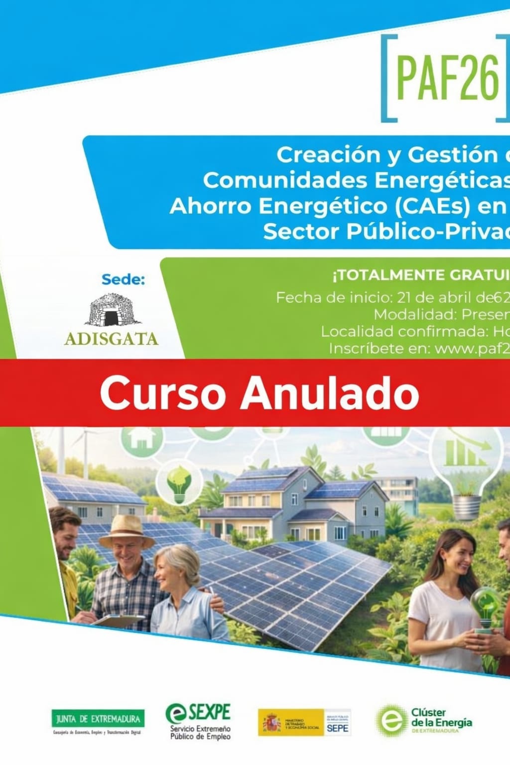 Nos informan que, el curso de “Creación y Gestión de Comunidades Energéticas y Ahorro Energético (11CLU)” programado para el día 21 de abril de 2026 en el Centro de Profesores y Recursos de Hoyos y organizado por el Clúster de la Energía de Extremadura ha sido ANULADO debido a que no se ha alcanzado el número mínimo de alumnos necesarios para su realización.