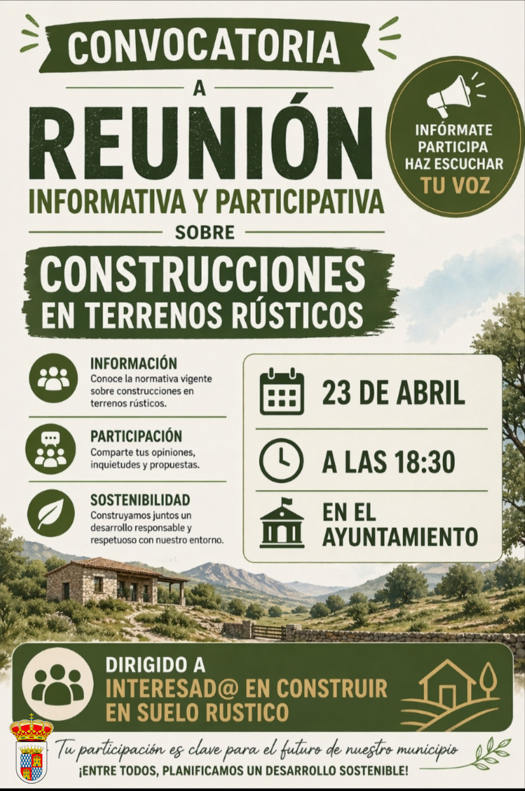 📌SE CONVOCA A, TODAS LAS PERSONAS INTERESADAS EN CONSTRUIR EN TERRENOS RUSTICOS, A UNA REUNIÓN EL PRÓXIMO DÍA 23, JUEVES A LAS 18:30 H. EN EL AYUNTAMIENTO.
