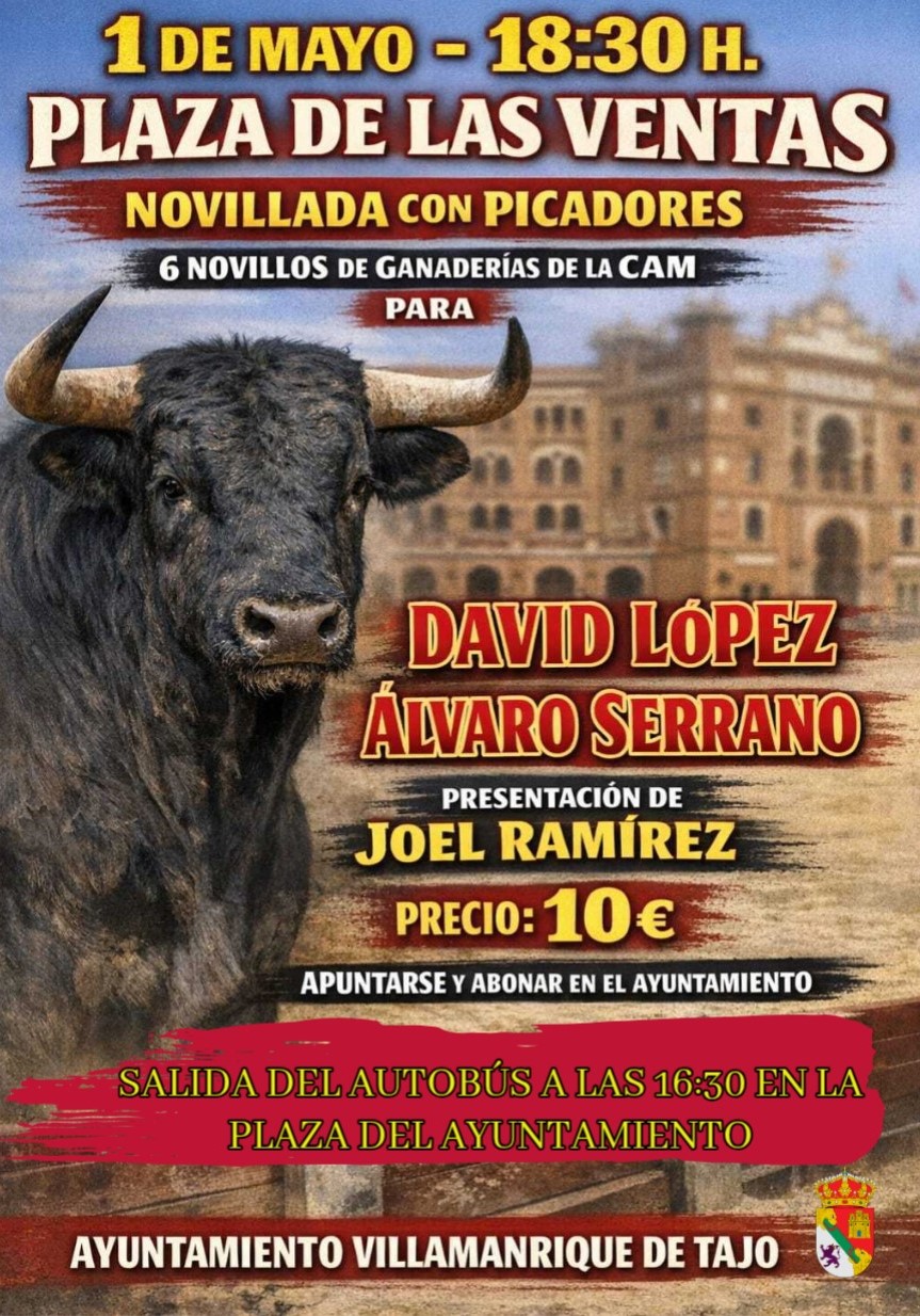 Entradas y autobús para ir a las Ventas el 1 de Mayo. El autobús saldrá de la Plaza del Ayuntamiento a las 16:30 h.Precio 10€ por el autobús ida y vuelta.Apuntarse y abonar los 10€ en el Ayuntamiento.Entradas hasta agotar plazas.