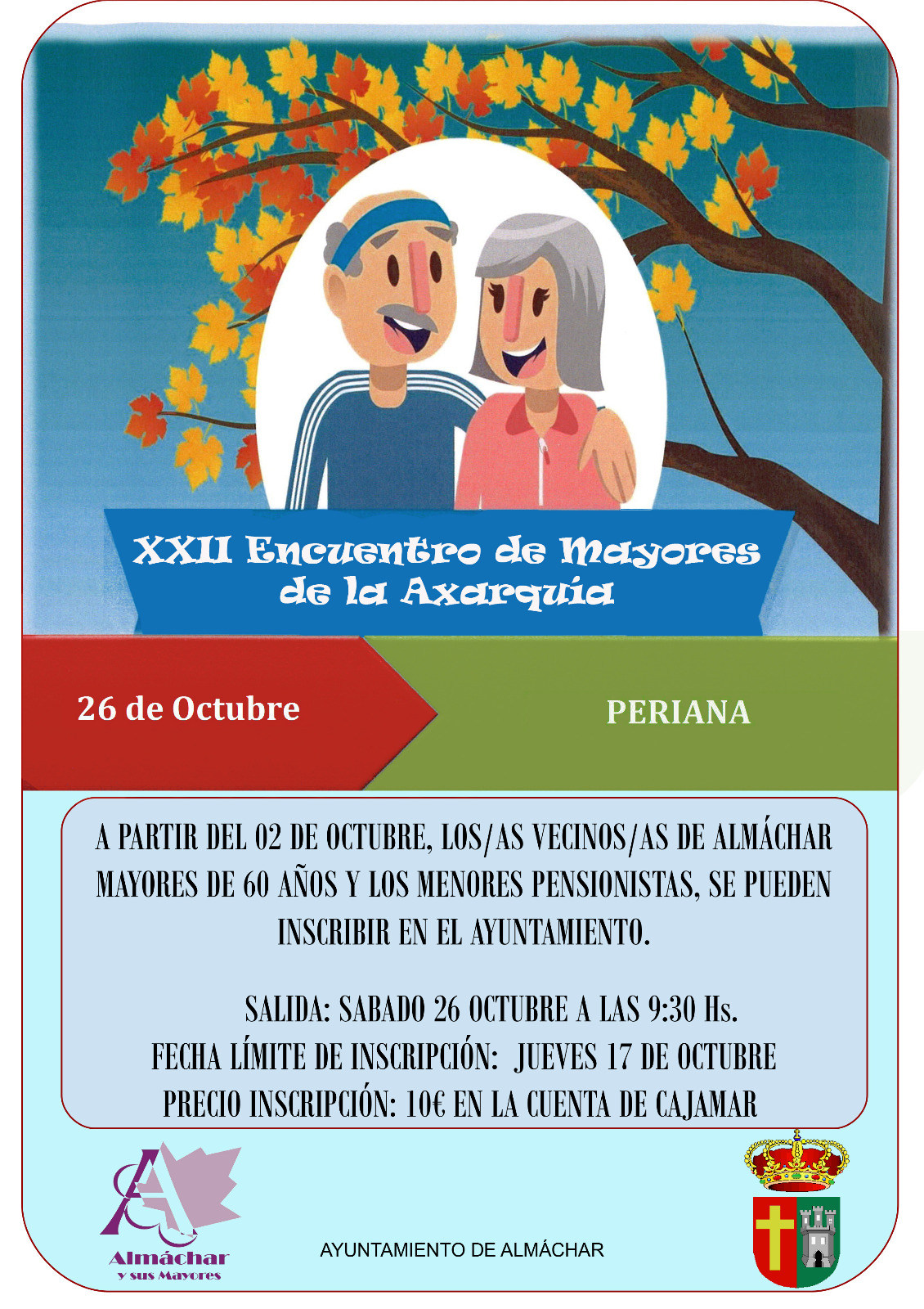 El 26 de octubre se celebra el XXII Encuentro de Mayores de la Axarquía, este año el pueblo anfitrión en acoger dicho encuentro es Periana. A partir de mañana día 2 de octubre abrimos el plazo de inscripción para que nuestros vecinxs de Almáchar mayores de 60 años y los menores pensionistas se puedan apuntar. El precio es de 10€ que deben ingresar en la cuenta del Ayuntamiento (Cajamar) y plazo límite para inscribirse es el jueves 17 de octubre. La salida es del Paseo de la Axarquía a las 09:30 hs. Vente y disfruta este día junto a lxs compañerxs de la Axarquía. Almáchar con sus Mayores