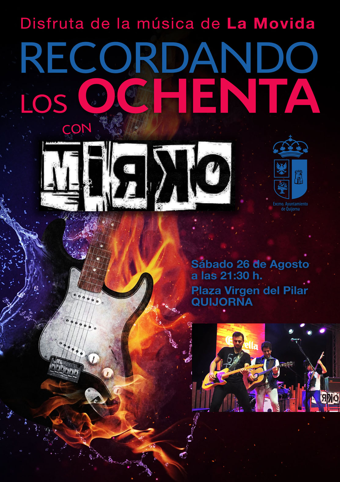 El sábado 26 de agosto ven a la Plaza Virgen del Pilar. A partir de las 21:30 h. recordaremos la Movida Madrileña con el grupo MIRKO. ¡A disfrutar de la música de los Ochenta!