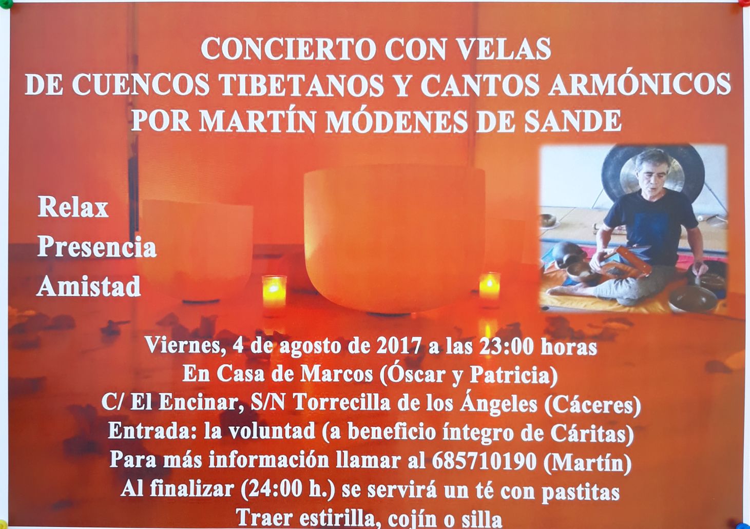 EL VIERNES 4 DE AGOSTO A LAS 23:00 HORAS EN CASA DE ÓSCAR Y PATRICIA SE CELEBRARÁ UN CONCIERTO POR MARTÍN MÓDENES DE SANDE CON VELAS, CUENCOS TIBETANOS Y CANTOS ARMÓNICOS, LA ENTRADA SERÁ LA VOLUNTAD.