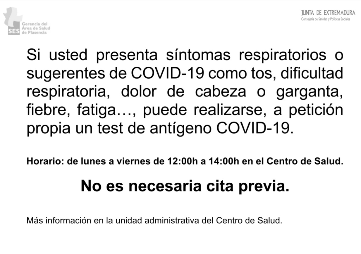 Si tiene algún síntoma de covid19, no dude en hacerse un test de antígeno en el centro de salud de Mohedasde Granadilla, en horario de 12:00 a 14:00 horas, de lunes a viernes.