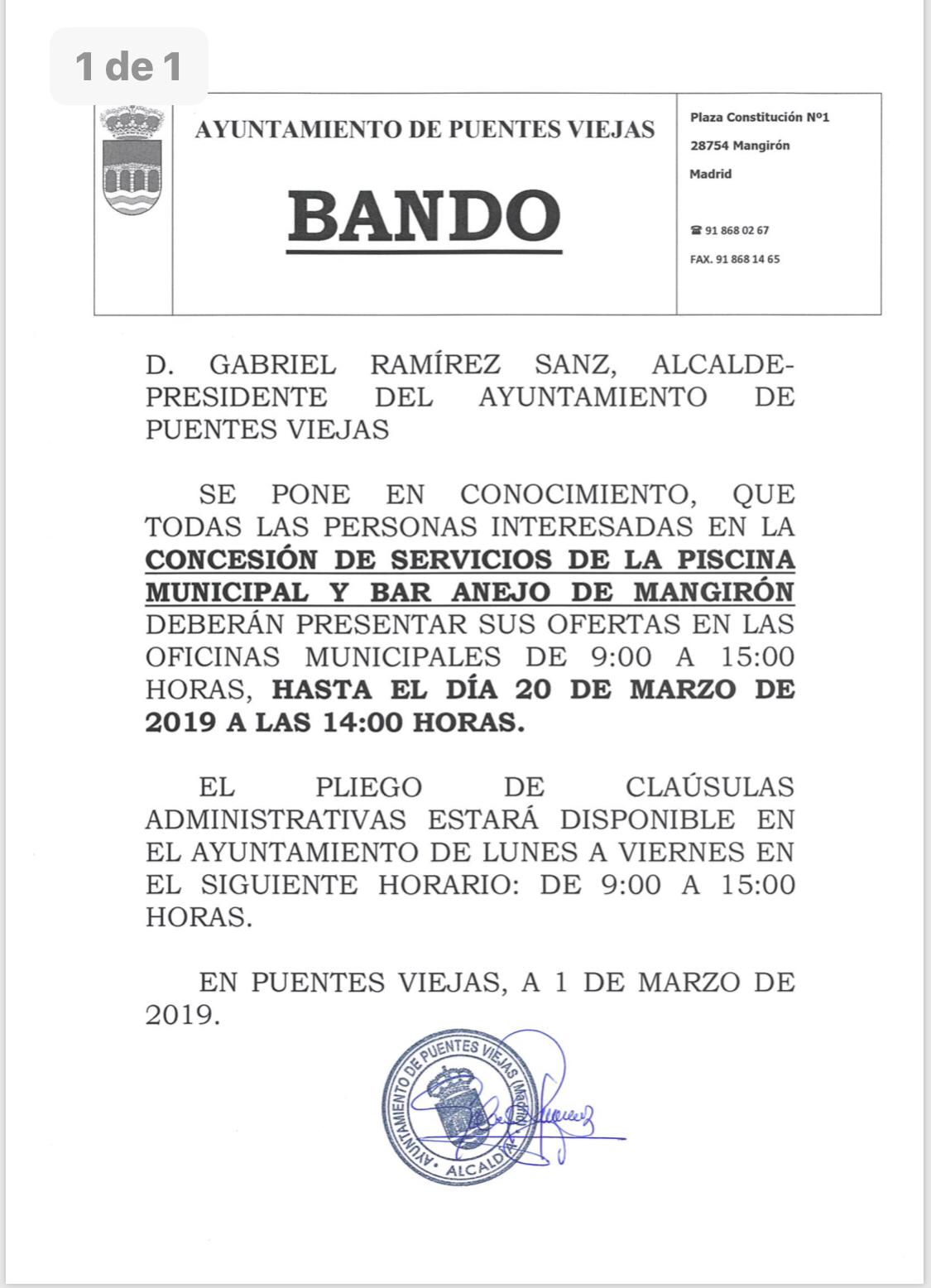 CONCESIÓN DE SERVICIOS DE LA PISCINA MUNICIPAL Y BAR ANEJO DE MANGIRÓN. MÁS INFORMACIÓN AYUNTAMIENTO DE PUENTES VIEJAS HORARIO DE 9:00 A 15 HORAS. TELÉFONO: 918680267