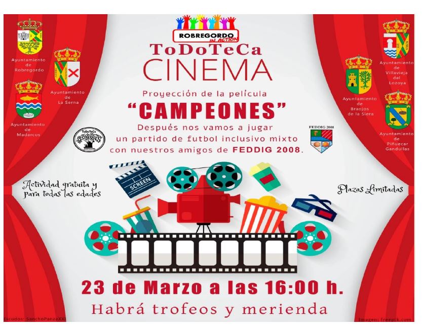 El Programa: 16:00h. Vemos la película Campeones. 18.30h Jugamos un partido de fútbol inclusivo y mixto con los chavales de FEDDIG2008. 19.30h. Hacemos la entrega de trofeos y merendamos. Esta actividad forma parte de un proyecto que pretende sensibilizar sobre la importancia de la inclusión de los y las jóvenes con algún tipo de discapacidad (diversidad funcional) en todos los aspectos de la vida diaria. La actividad promueve el trabajo común de varios Ayuntamientos y está vinculada al proyecto solidario Robregordo en Acción, a la entidad organizadora FEDDIG2008 y a un proyecto vecinal, la Todoteca. ¡Anímate a participar!! Puedes inscribirte en el Ayuntamiento (91 868 14 61) y en el Bar-social de Madarcos.