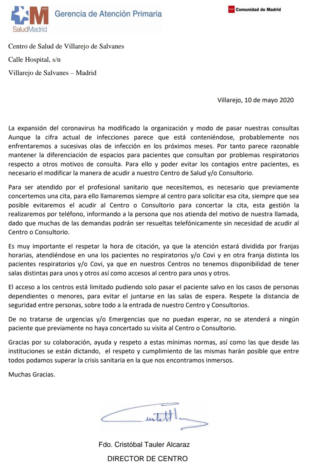 El próximo día 13, se vuelve abrir el Centro de Salud en Villamanrique de Tajo, es imprescindible concertar cita telefónica, ya que por seguridad se ha modificado el protocolo de atención a los pacientes.