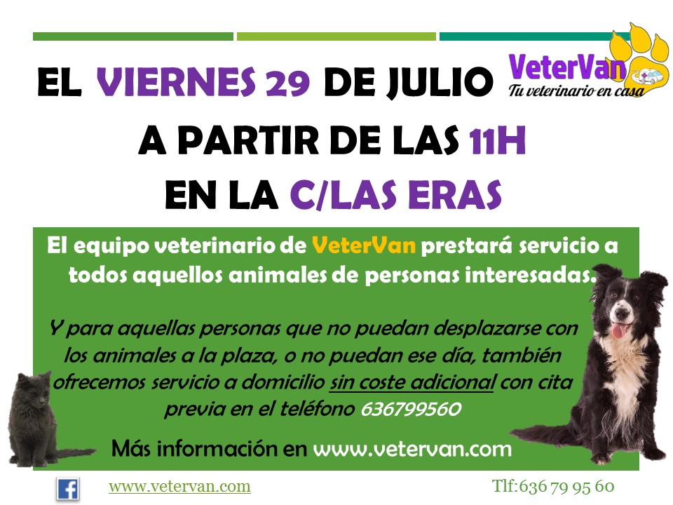 Se informa a tod@s l@s vecin@s, que mañana Viernes, a partir de las 11:00h, en la Plaza de las Eras, el equipo veterinario de VeterVan, estará prestando sus servicios.
