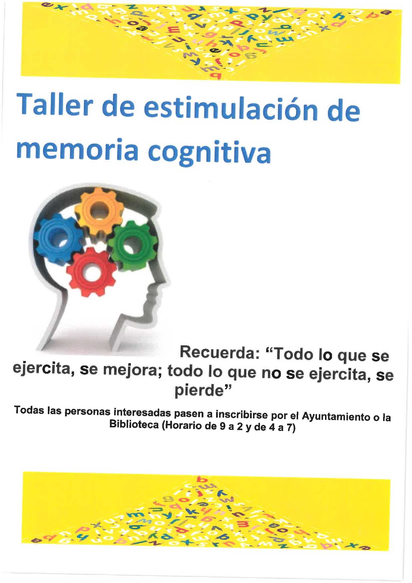 Se recuerda a todas las personas interesadas en inscribirse a un Taller de estimulación de memoria, que pasen por el Ayuntamiento o Biblioteca.