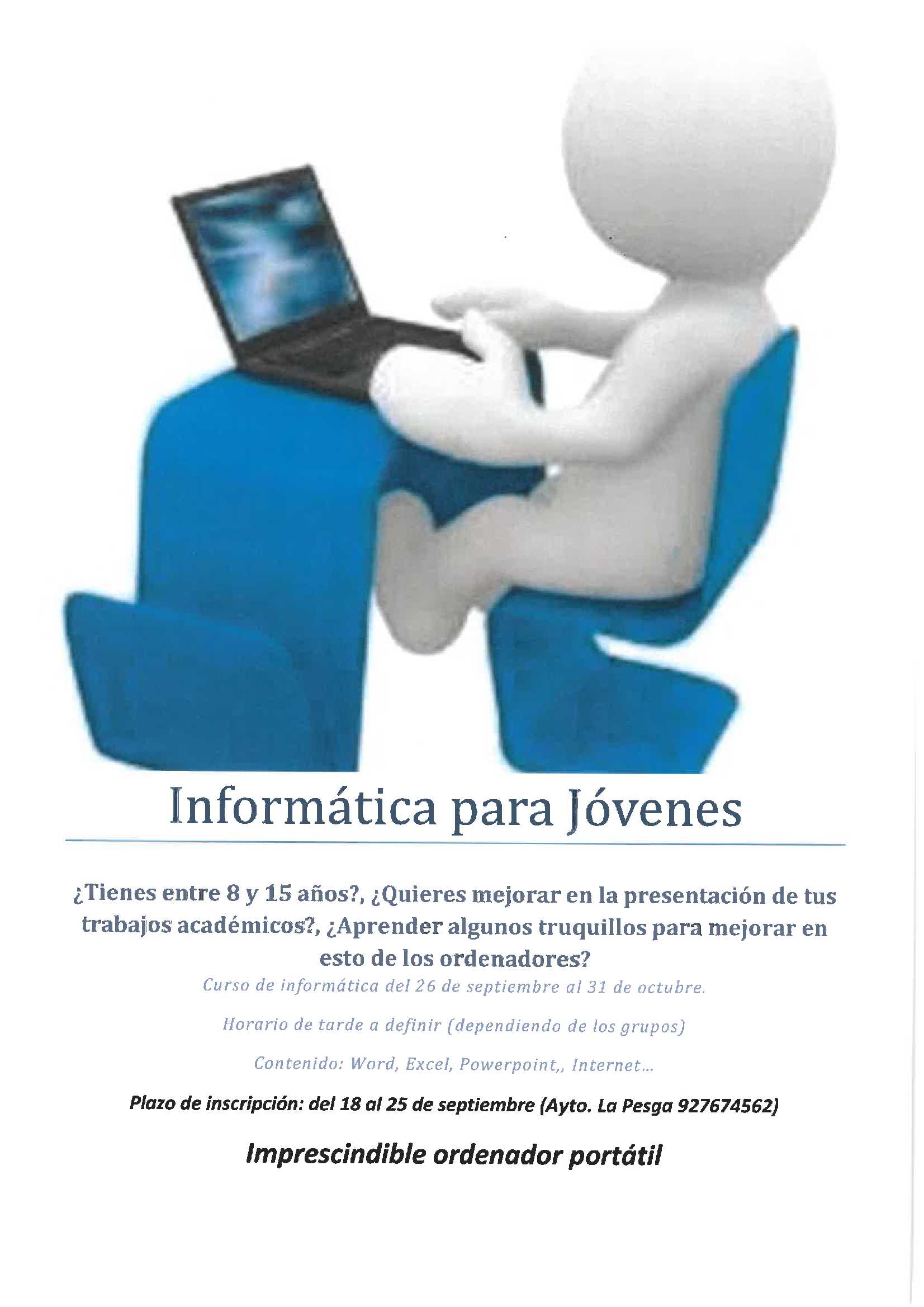 Se informa a los jóvenes de edades comprendidas entre 8 y 15 años, interesados en realizar un curso de informática del 26 al 31 de Octubre, en horario de tarde. Plazo de Inscripción: del 18 al 25 de Septiembre Lugar: Ayuntamiento.
