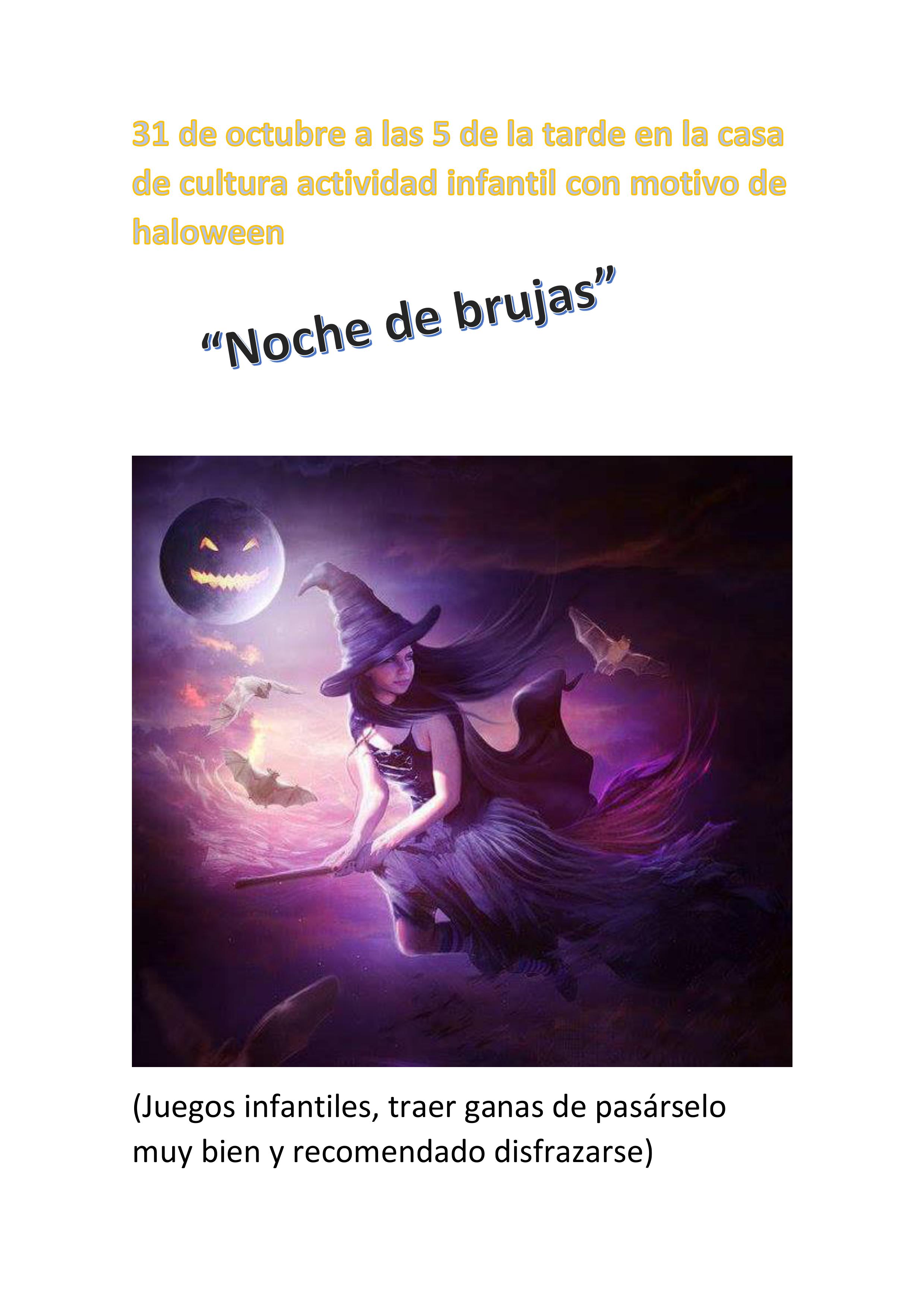 Se informa, a todos los interesados, que el 31 de Octubre, a las 17:00 horas, tendrĂ¡ lugar una actividad infantil, con motivo de la Noche de Brujas, en la Casa de Cultura.