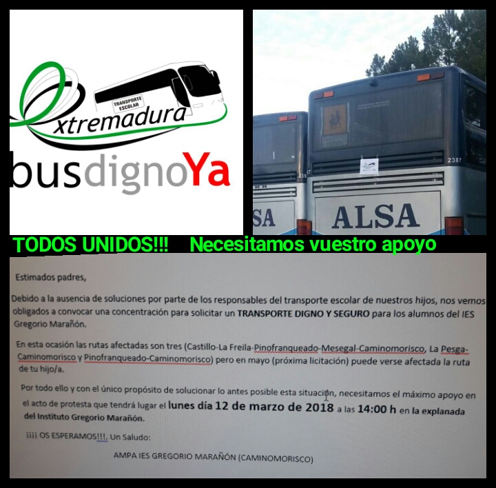 Se informa a todos los vecinos, que el lunes a las 14:00 horas tendrá lugar una protesta en la puerta del instituto de Caminomorisco, debido a los problemas con el transporte escolar. Acompañarnos, necesitamos el máximo apoyo.