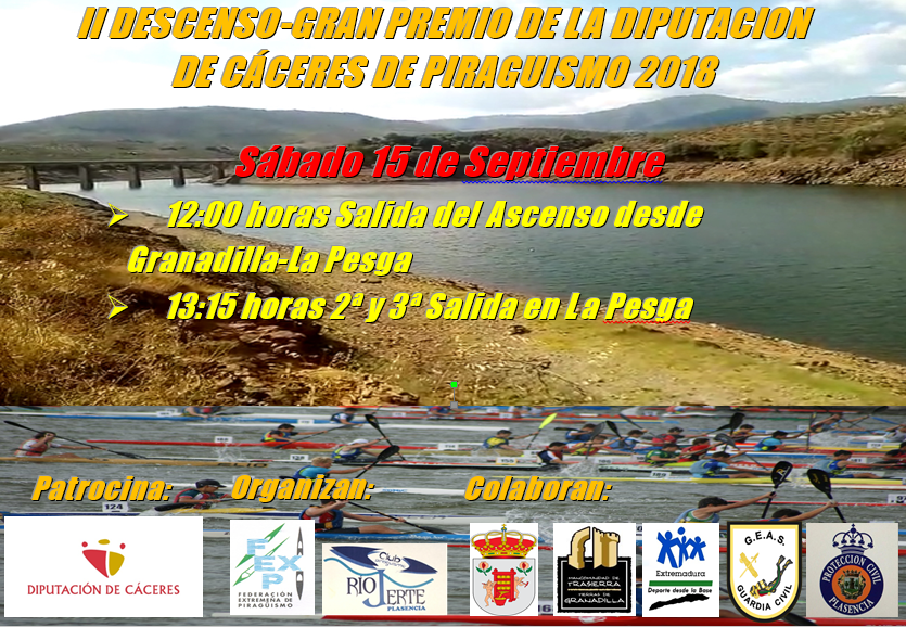 Se informa a todos los vecinos que el próximo sábado, día 15, tendrá lugar el II Descenso – Gran premio de la Diputación de Cáceres de piragüismo 2018. A las 12:00h salida del ascenso desde Granadilla – La Pesga. A las 13:15h segunda y tercera salida desde La Pesga. Se ruega no aparcar en las zonas limítrofes al concurso, desde El Carrascal al puente.