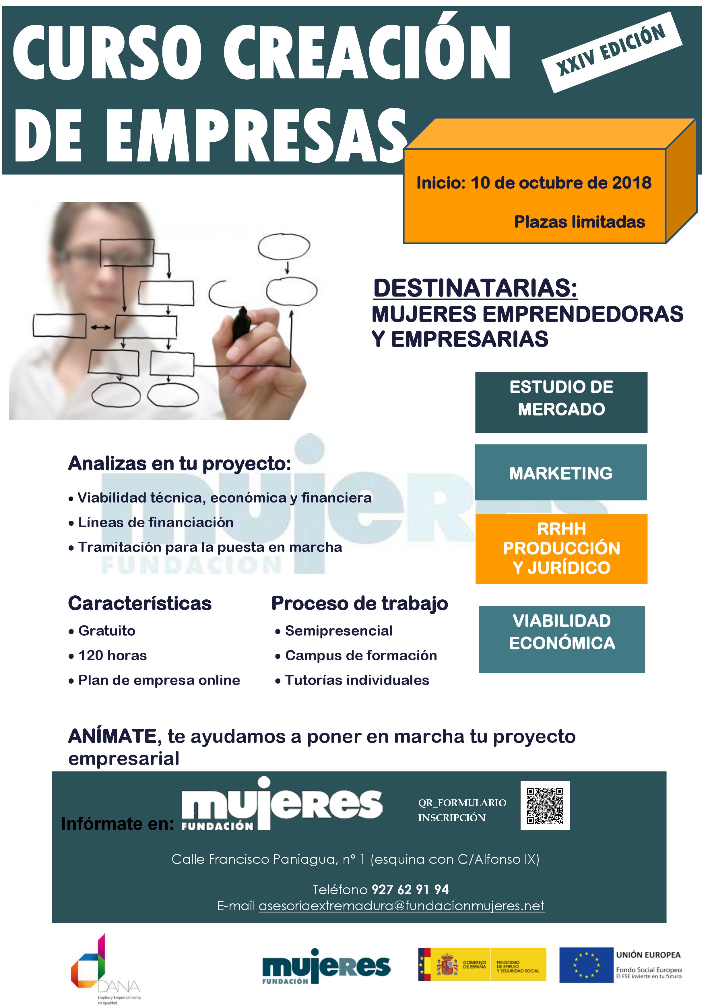 Fundación Mujeres de Cáceres imparte un curso de Creación de empresas. Si quieres poner en marcha tu proyecto empresarial o mejorar el que ya tienes, apúntate. Comienza el 10 de Octubre. Es de carácter semipresencial. Duración: 120 horas, con tutorías individuales, solo 4 sesiones presenciales. Pide más información o tramítalo a través de la Agencia de Desarrollo del Ayuntamiento.