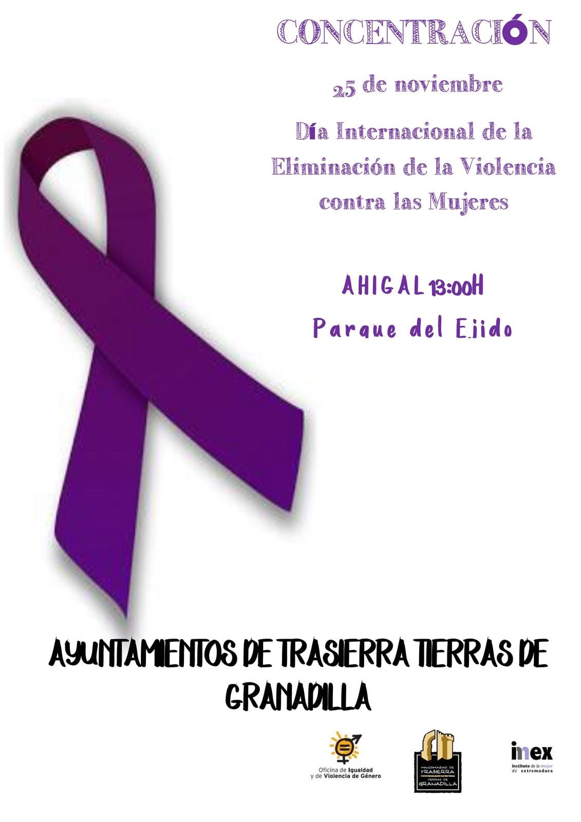 Se informa a todos los vecinos,que el día 25 de noviembre, a las 13:00 h, en el parque El Ejido (Ahigal), se llevará a cabo una concentración con motivo del Día Internacional contra la violencia de género.