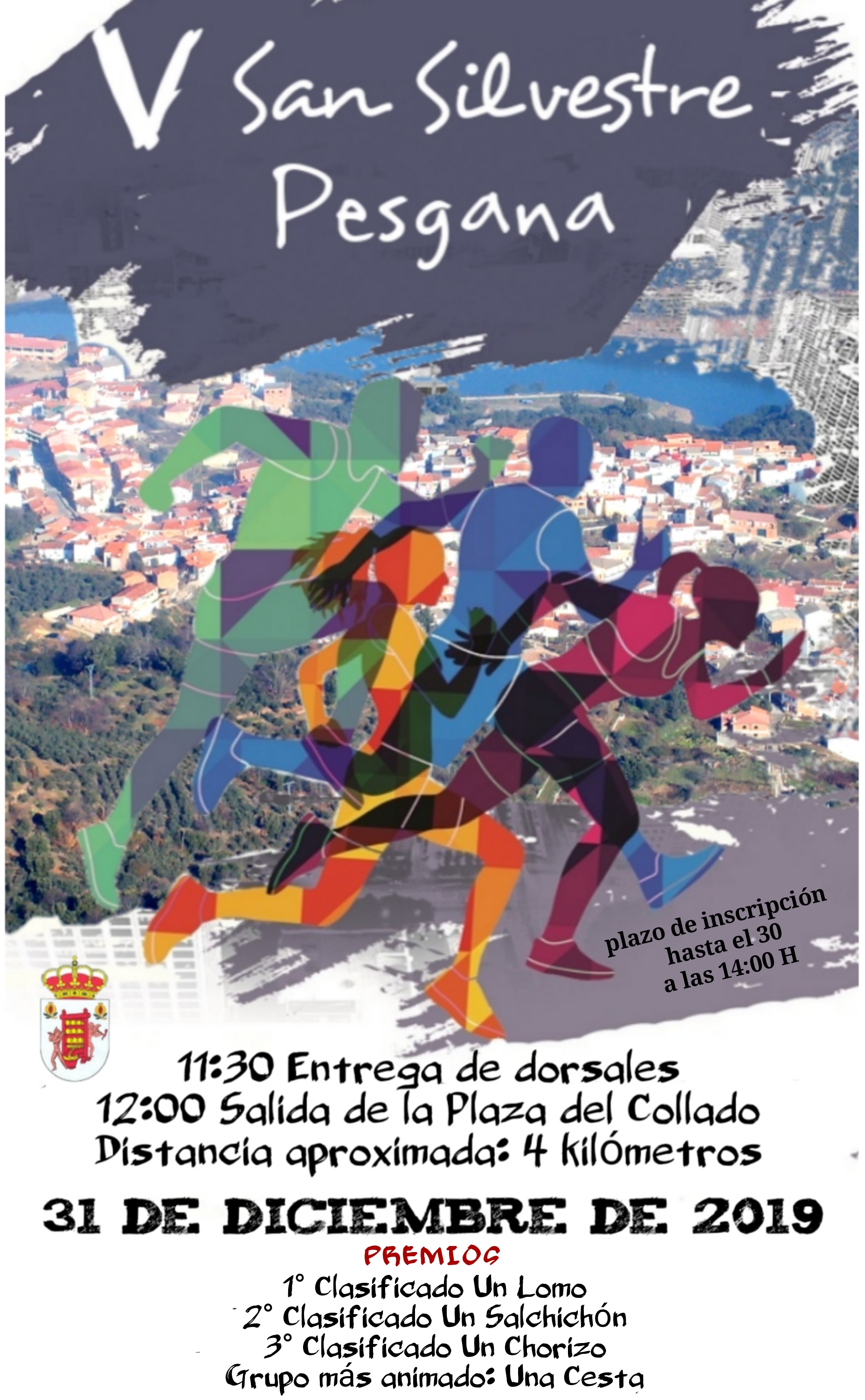 Se informa a tod@s l@s interesad@s que el próximo 31 de Diciembre, un año más se celebrará la Carrera San Silvestre Pesgana, en la Plaza del Collado, a partir de las 11:30h se entregarán los dorsales y a las 12:00 h dará comienzo la carrera. Plazo para inscribirse hasta el día 30 de Diciembre en la Oficina General del Ayuntamiento, en horario de oficina (09:00-14:00h). ¡OS ESPERAMOS!