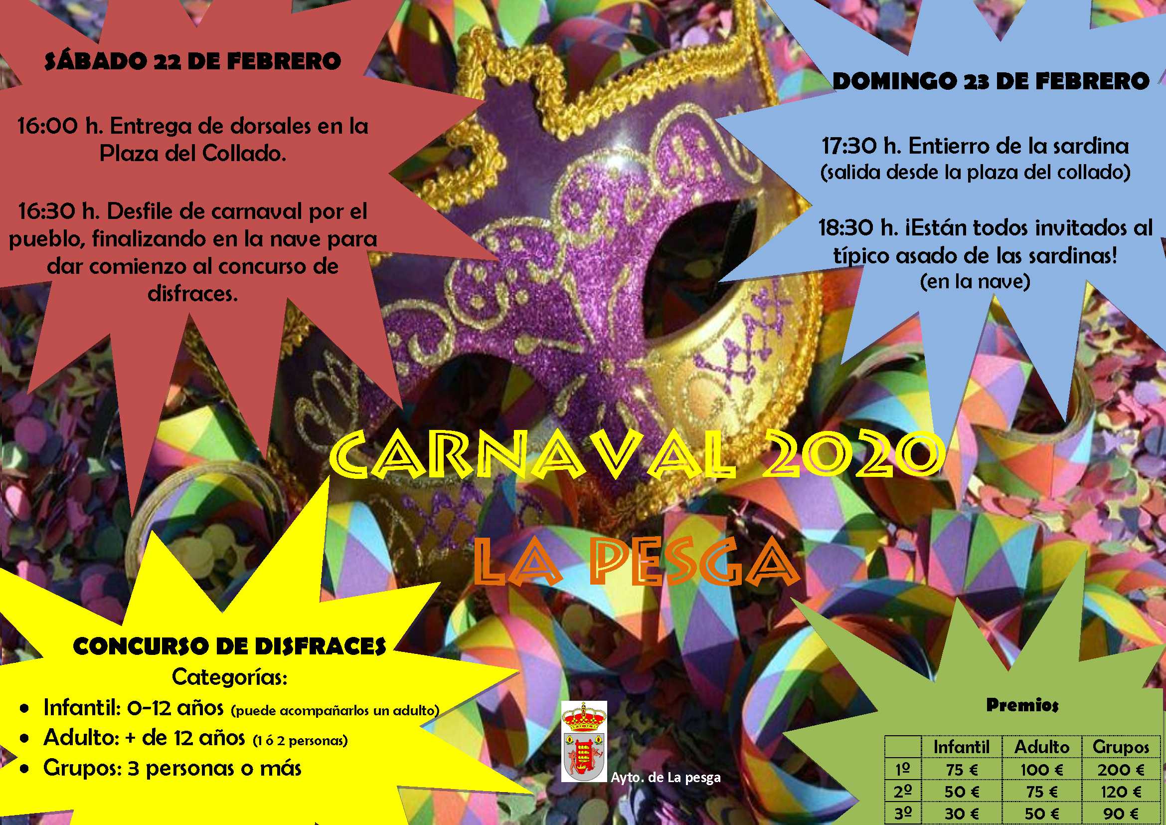 Se informa a todos los vecinos que el sábado 22 de Febrero se llevará a cabo el desfile de carnaval a las 16:00h desde la Plaza del Collado, finalizando en la Nave de las Eras donde dará comienzo el concurso de CARNAVALES 2020. CATEGORÍAS: INFANTIL: 0-12 AÑOS (pueden ir acompañdos de un adulto) ADULTO: + DE 12 AÑOS (1 ó 2 personas) GRUPOS: 3 PERSONAS O MÁS PREMIOS: Infantil: 1º 75€, 2º 50€ y 3º 30€ Adulto: 1º 100€, 2º 75€ y 3º 50€ Grupos: 1º 200€, 2º 120€ y 3º 90€ DOMINGO 23 DE FEBRERO: 17:30h Entierro de la sardina 18:30h Asado de la sardina en la Nave de Las Eras.