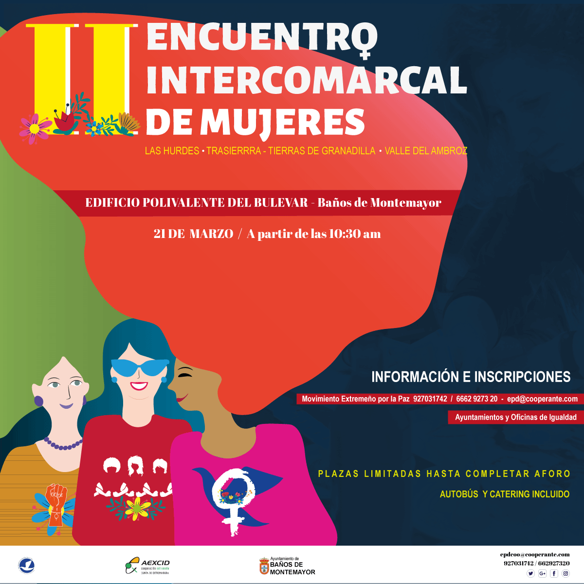 Las mujeres de las comarcas de Ambroz, Hurdes y Tierras de Granadilla se unen en el ya II Encuentro Intercomarcal de Mujeres. Este año será en Baños de Montemayor, el día 21 de Marzo. Puedes informarte en los tfnos o correos que aparecen en el cartel que se adjunta. Para poder ir en autobus, puedes inscribirte a través de la Asociación de mujeres o directamente en el Ayuntamiento si no perteneces a la Asociación. Último día de inscripción: 13 de marzo.