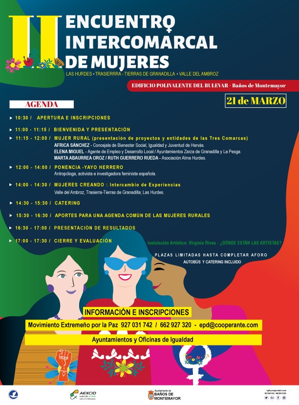 Este año el II Encuentro Intercomarcal de mujeres se celebra en Baños de Montemayor el día 21 de Marzo a partir de las 10:30 h. Puedes inscribirte antes del 13 de marzo en el Ayuntamiento, a través de la Asociación de mujeres o en el siguiente enlace: https://forms.gle/v89egL59eM2aHErs6 (plazas limitadas hasta completar aforo)