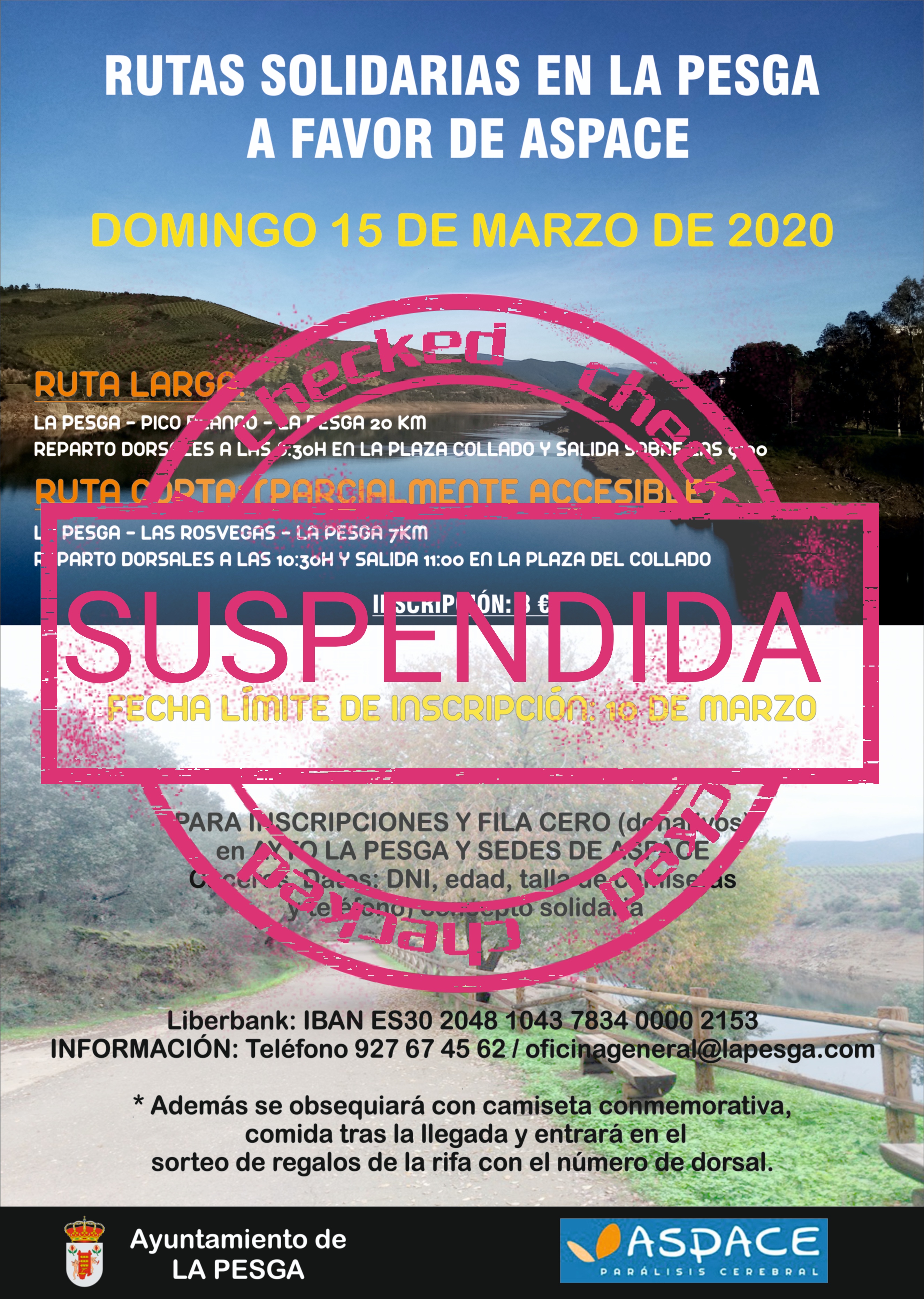 Se informa a todos/as los/as inscritos/as en las rutas solidarias a favor de ASPACE que quedan suspendidas momentaneamente, por razones de seguridad sanitaria. Quien lo desee, podrá recuperar el importe de su inscripción en el ayuntamiento, ya que de momento no se sabe cuando se podría realizar dicho evento. Disculpen las molestias