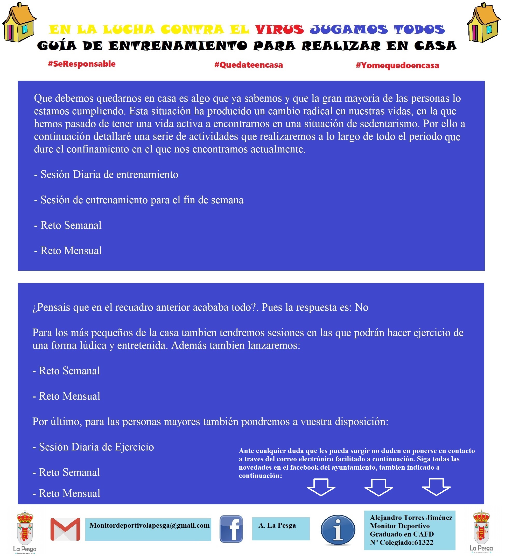 Se informa a quienes estén interesados/as en realizar ejercicio físico desde casa, que el monitor deportivo organizará una serie de actividades físicas para evitar el sedentarismo. Quédate en casa. Yo me quedo en casa
