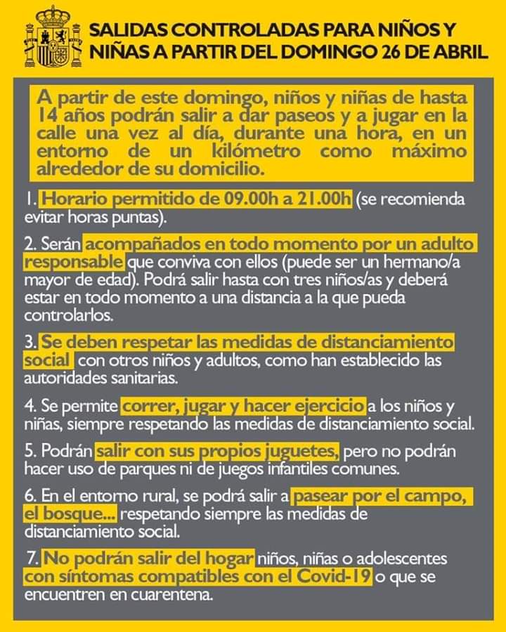 Se informa a toda persona que a continuación, se adjunta el procedimiento normativo sobre la salida de menores en compañía de adultos durante el período de confinamiento. Se recuerda que no se pueden acceder a parques infantiles. Se recomienda salir el tiempo imprescindible y tomar las medidas adecuadas para evitar posibles contagios.