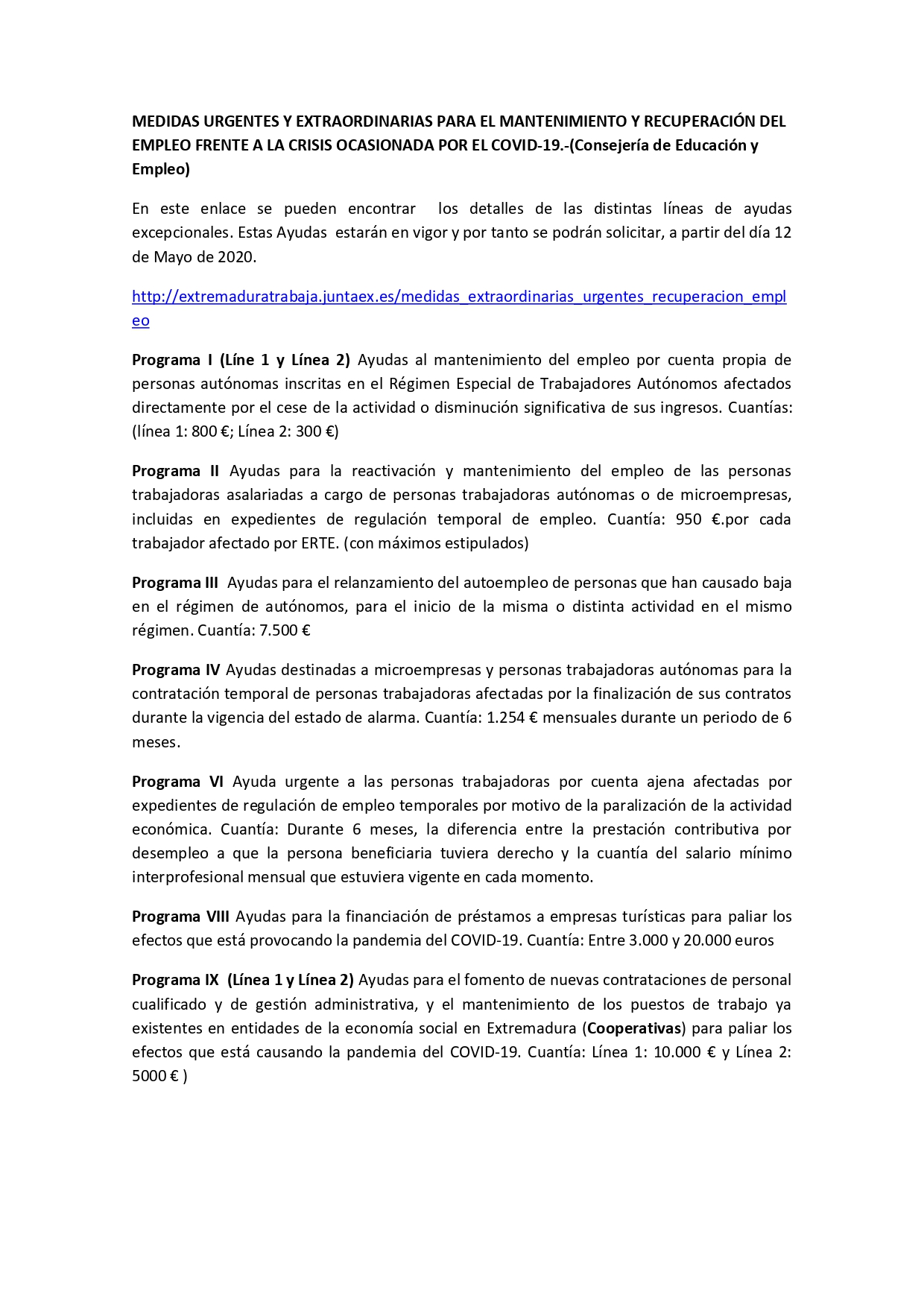 A través del SEXPE se han convocado Ayudas urgentes destinadas a autónomos, trabajadores afectados por ERTE, cooperativas, sector turístico, etc. Lean detenidamente el documento que se adjunta y si lo desean contacten después con la Agencia de Desarrollo Local para su información en detalle y posterior tramitación. aedl@lapesga.es / Tfno: 645969645