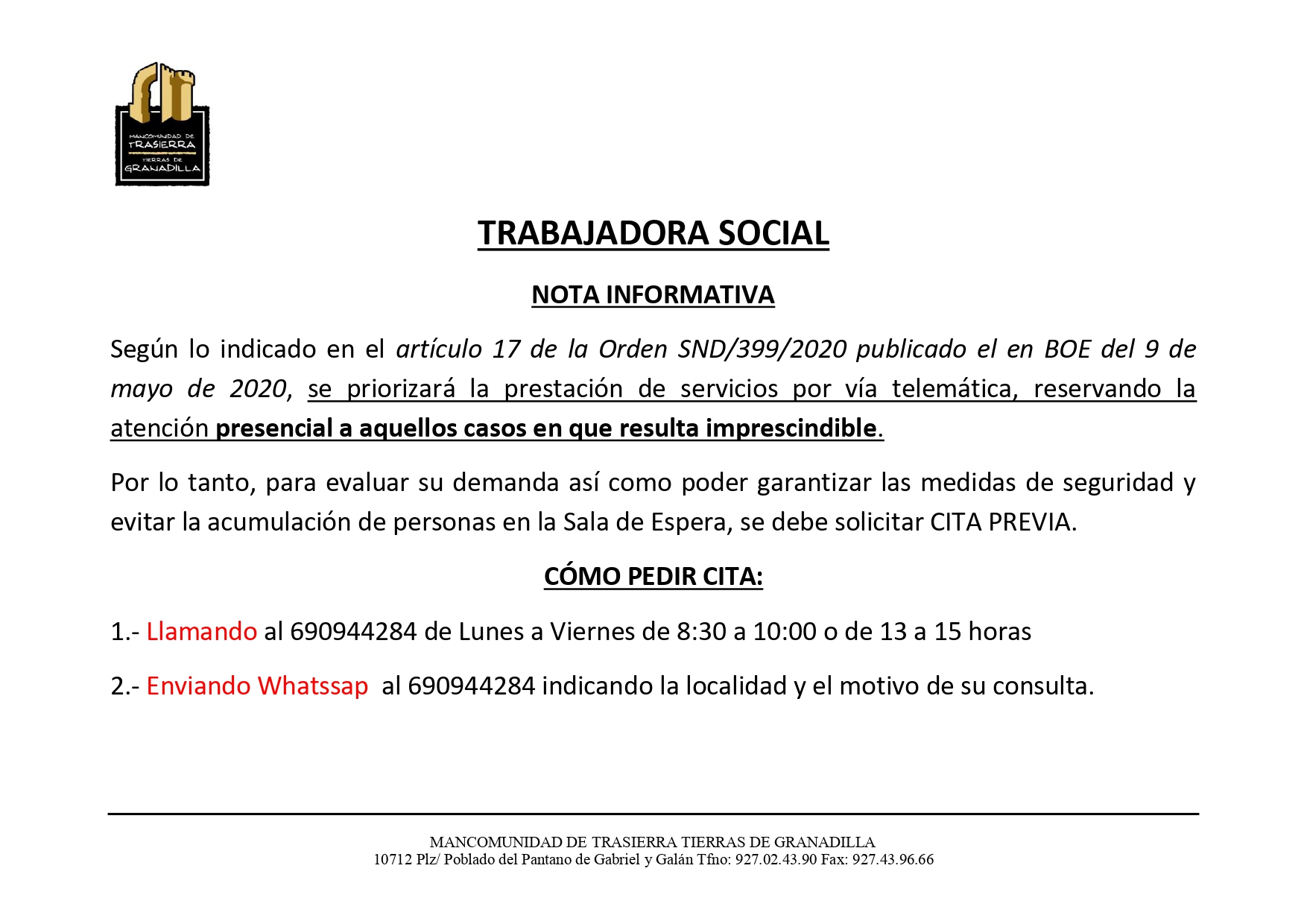 Mientras dure el Estado de Alarma, los servicios se prestarán telemáticamente, salvo casos imprescindibles. La trabajadora social recuerda que se necesita cita previa. Lean el documento adjunto