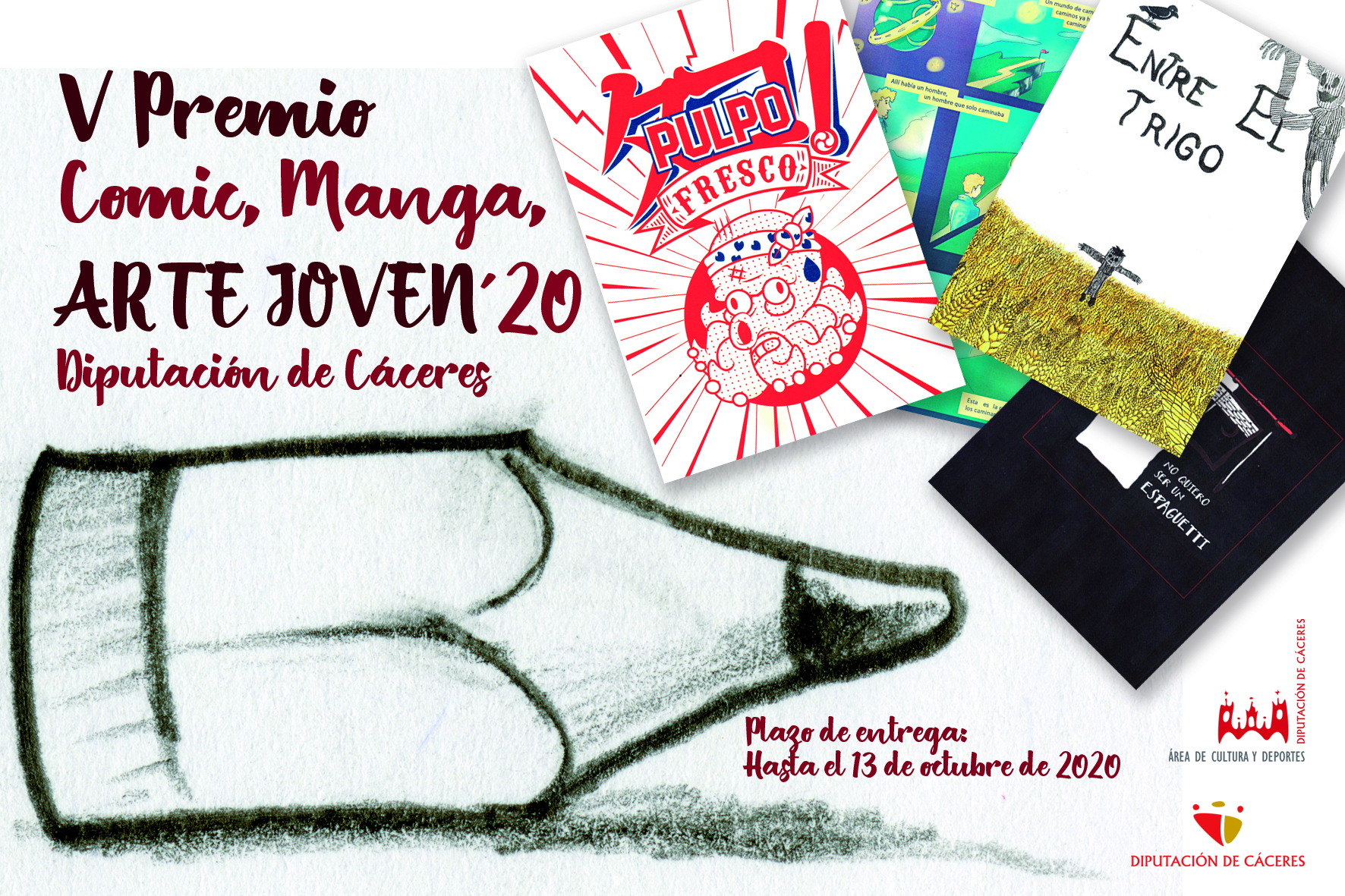 V EDICIÓN PREMIO CÓMIC / MANGA / ARTE JOVEN Objeto: Promover e incentivar la creación plástica, dentro de los objetivos del Área de Cultura, comprometida con la promoción y difusión de la actividad cultural, al tiempo que promover los nuevos valores en el ámbito del Cómic. Plazo: Desde el día siguiente a la publicación de las bases en el BOP hasta el 13 de octubre de 2020 Destinatarios: Edades entre 14 y 35 años a fecha 31 de diciembre de 2020. Se establecen dos categorías: Premios: Junior : de 14 a 20 años Senior: de 21 a 35 años Categoría Senior: Un primer premio de 2000 euros y diploma Un segundo premio de 1000 euros y diploma Categoría Junior: Un primer premio de 1000 euros y diploma Un segundo premio de 500 euros y diploma Pueden consultar las bases en el siguiente enlace: https://cloud.dip-caceres.es:5001/sharing/EKxtLFsTB