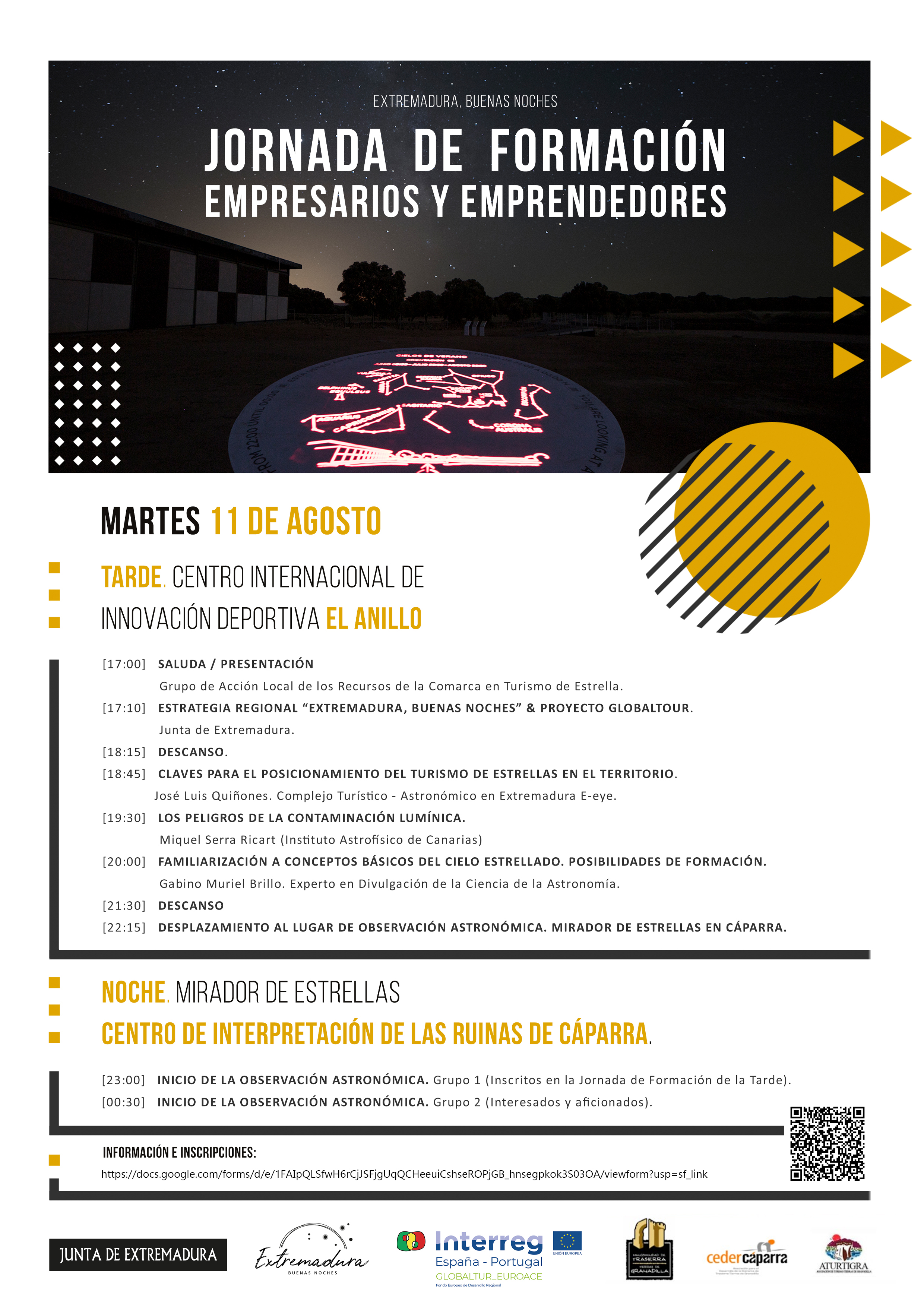 Se celebrará el Martes, 11 de Agosto en el Anillo. Estas jornadas de formación están destinadas primordialmente al sector empresarial del turismo y emprendimiento, se tratarán entre otros temas, el Astroturismo como estrategia de desarrollo en el territorio, los peligros de la contaminación lumínica, etc. Incluye observación astronómica nocturna. En el documento adjunto se pueden ver más datos y enlace de inscripción. Si usted es empresario/a del sector turístico de La Pesga y no fuera posible la inscripción, comuníquelo en el Ayuntamiento.