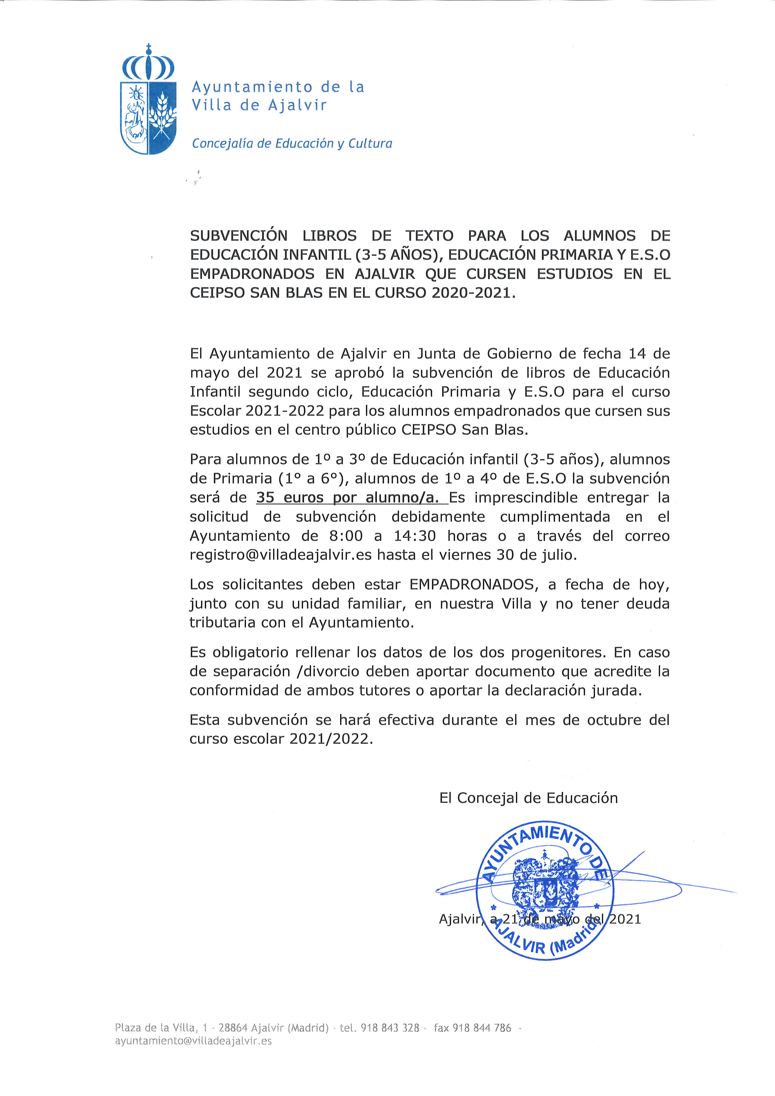 El Ayuntamiento de Ajalvir a través de la Concejalía de Educación, abre el plazo de subvención de ayuda de libros de texto curso 2021/2022 para los alumnos de Educación Infantil, Primaria y Secundaria empadronados en Ajalvir y que cursen sus estudios en el centro público CEIPSO San Blas.