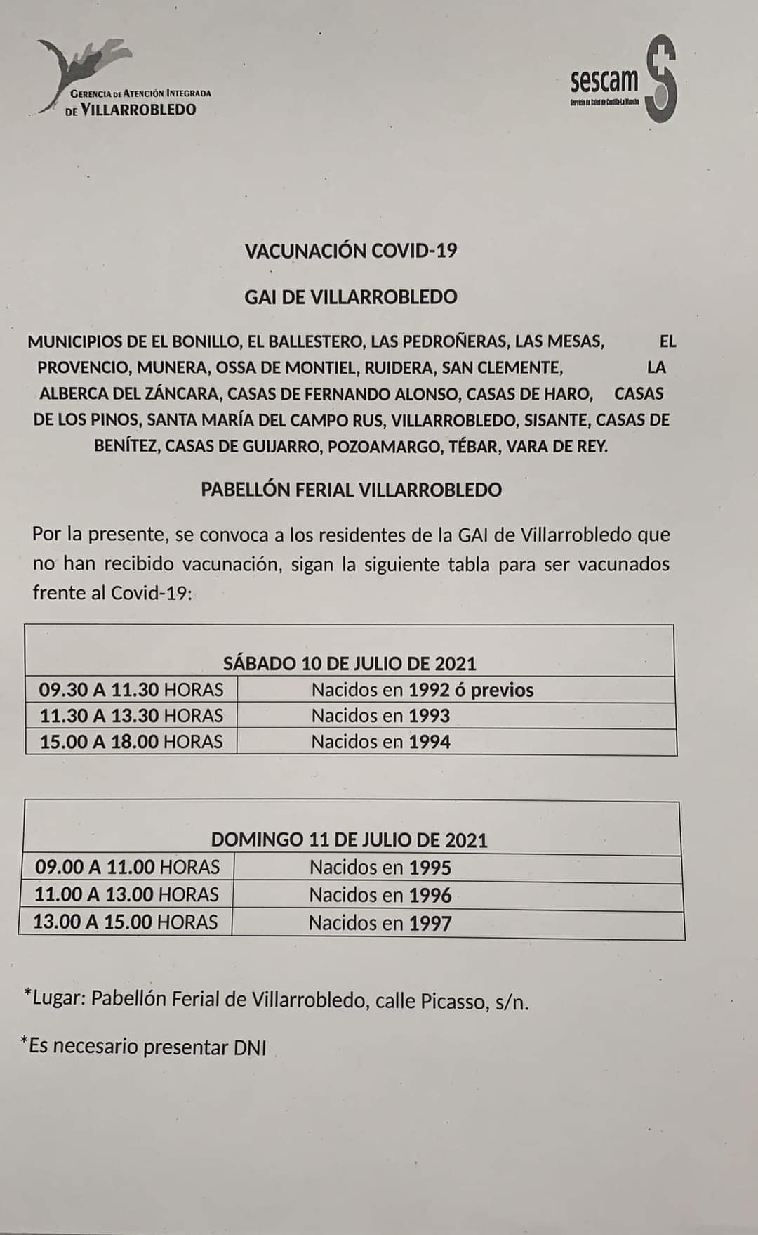 VER DOCUMENTO ADJUNTO PARA SER VACUNADO EN EL PABELLÓN FERIAL DE VILLARROBLEDO