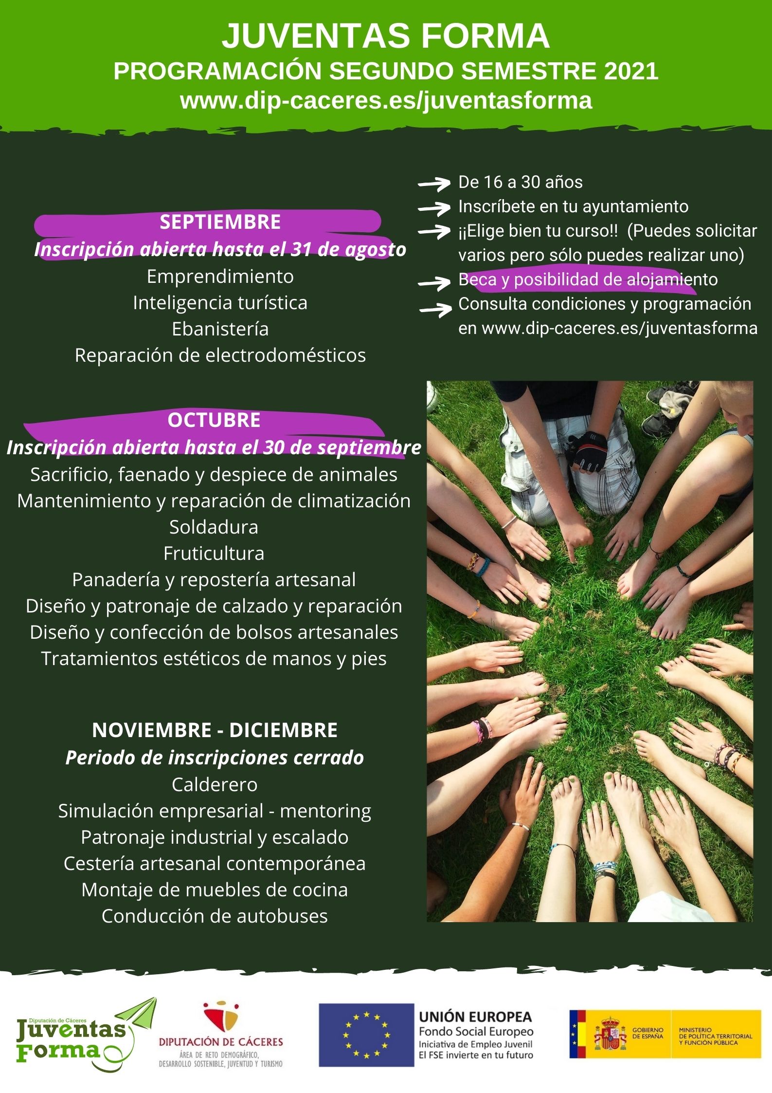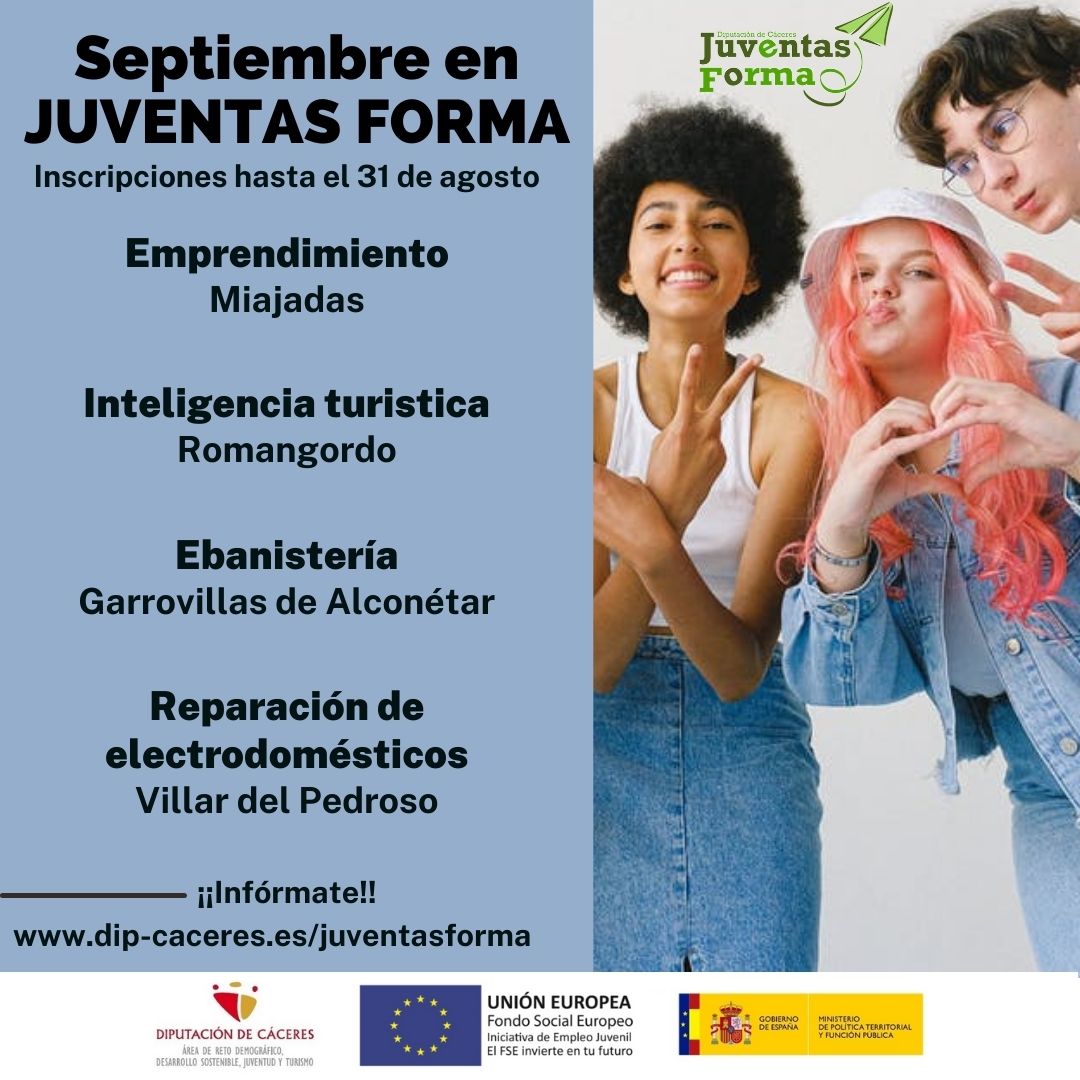 Se informa a los jóvenes entre 16 y 30 años que hay plazo hasta el 31 de Agosto, para inscribirse a los cursos Juventas Forma, de Diputación de Cáceres.