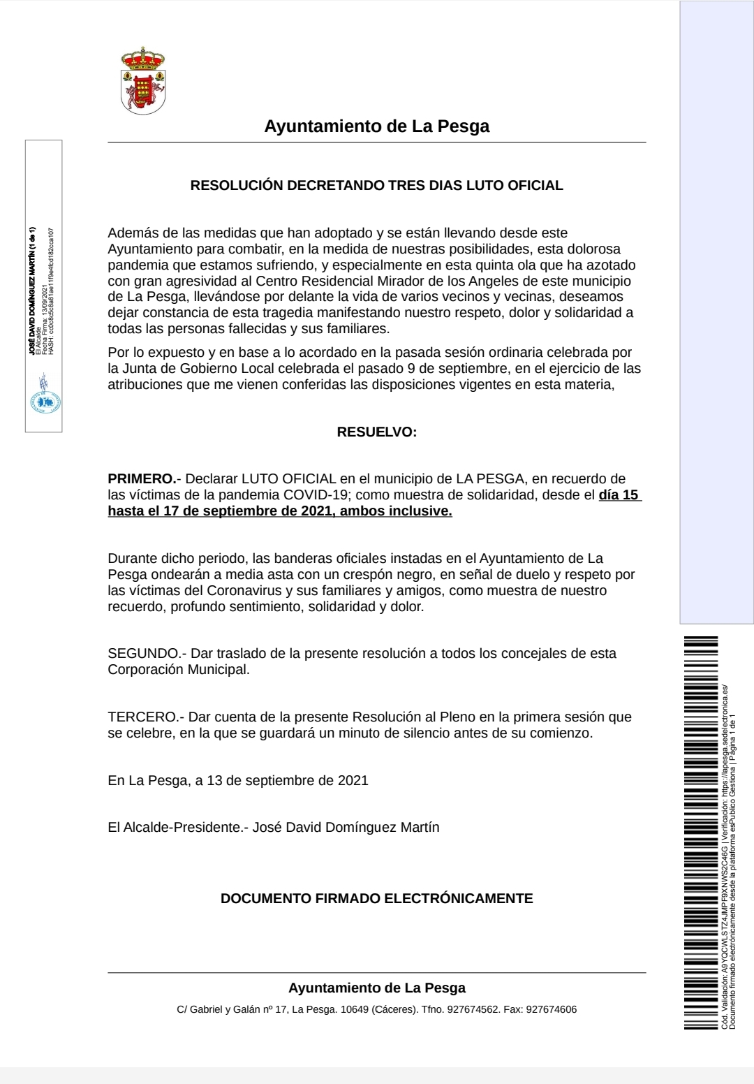 Se informa que tras los terribles efectos acarreados por la quinta ola de la pandemia en nuestra localidad, el Ayuntamiento de La Pesga ha decidido declarar 3 días de luto oficial por la pérdida de parte de una generación que tanto ha dado a nuestro pueblo. Además de reconocer, a todas las personas que han sido afectadas y que han luchado, luchan y lucharán contra el maldito covid19