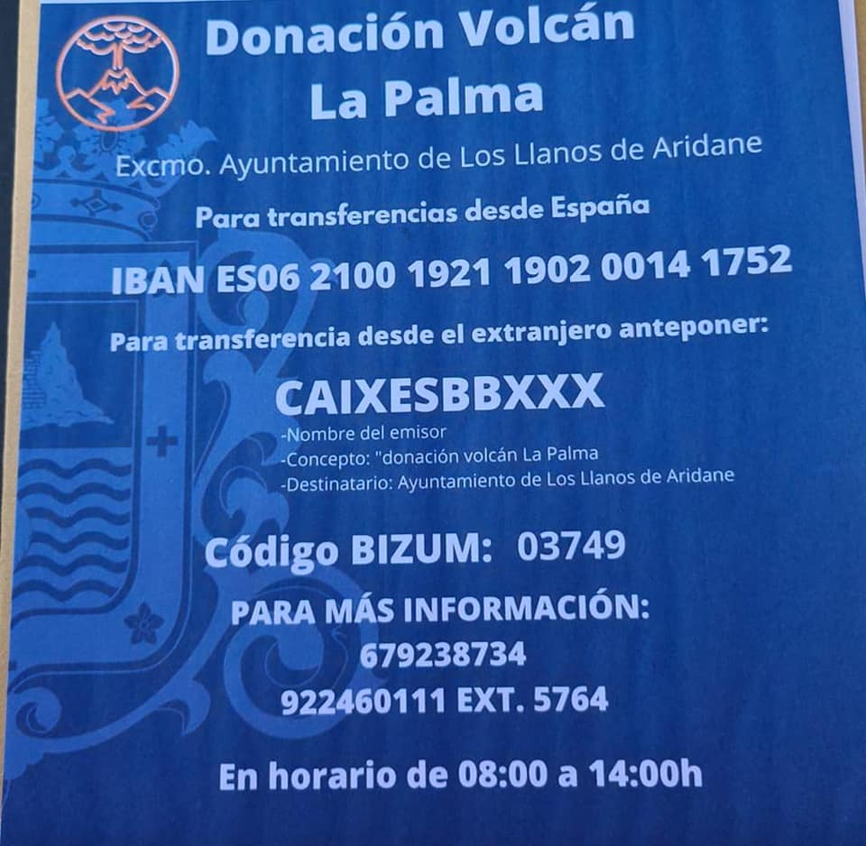 También se pueden hacer ingresos a la cuenta del ayuntamiento de los Llanos de Aridane uno de los pueblos más afectados.
