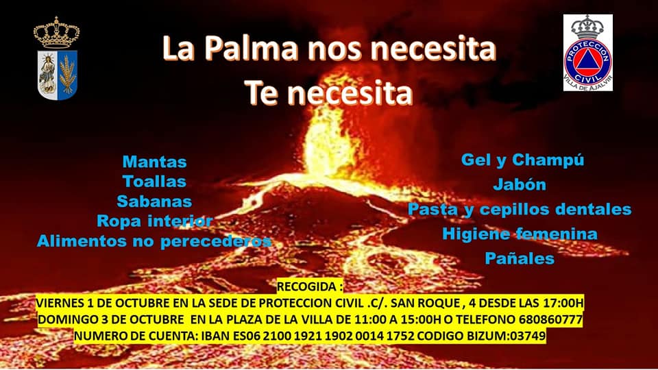 Desde la agrupación de protección civil junto con el ayuntamiento y varias agrupaciones de otros municipios se va hacer una recogida de alimentos no perecederos, artículos de higiene y ropa de hogar para los damnificados por la erupción del volcán de la Palma.