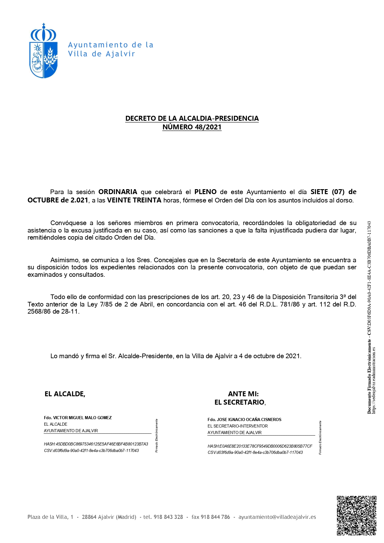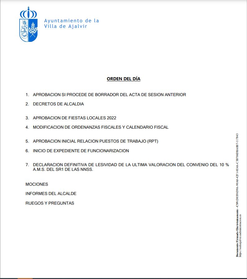 Convocatoria del pleno ordinario el jueves 7 de octubre de 2021 a las 20.30 horas, con las siguientes modificaciones para asistencia del público: