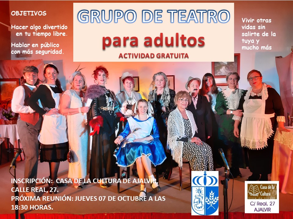 El jueves 7 de octubre a las 18:30 h, dará inicio un curso más el Grupo de Teatro de Ajalvir, que nació con el espíritu de dar una alternativa de ocio y diversión, además de inculcar el amor por la cultura y el conocimiento de la obra teatral. Este interesante proyecto cuenta con la dirección de Doña Reyes Lazcano y un elenco de personas aficionadas al teatro.