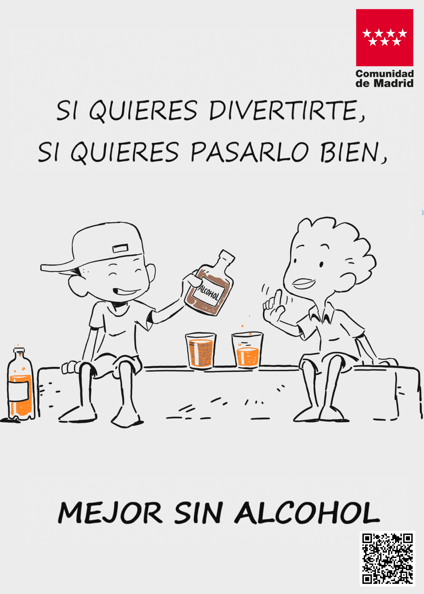 La Consejería de Sanidad de la Comunidad de Madrid, coincidiendo con el inicio del curso escolar, pone en marcha la campaña divulgativa "Mejor Sin Alcohol" para sensibilizar tanto a adolescentes/jóvenes como a la población general sobre los riesgos y daños asociados al consumo de esta droga.