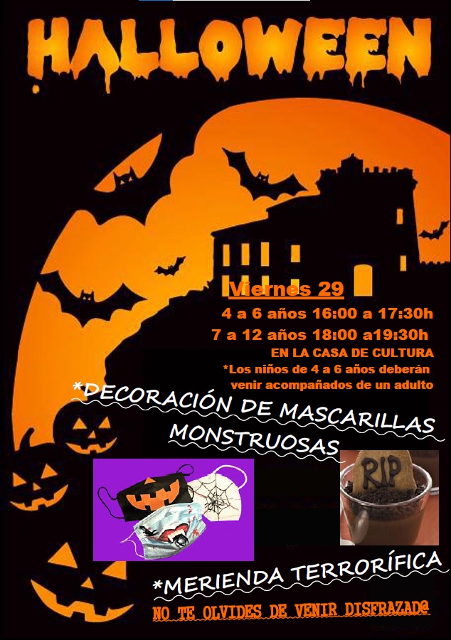 El taller de Halloween se realizará en la Casa de Cultura el próximo viernes 29 4 a 6 años 16:00 a 17:30h7 a 12 años 18:00 a19:30h No te olvides venir con tu disfraz * Los niños de 4 a 6 años deberán venir acompañados de un adulto
