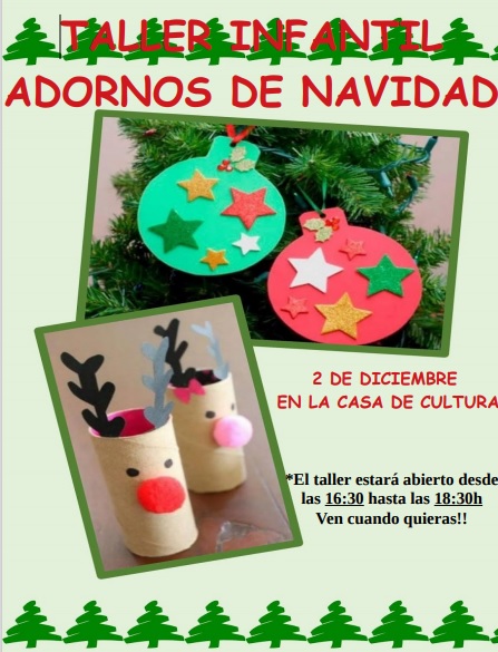 Se informa a todos los interesados, con edades comprendidas entre 4 y 12 años, que el el proximo jueves día 2 de diciembre, se realizará un Taller Infantil de Adornos de Navidad en horario de 16:30 a 18:30H, en la Casa de Cultura, no es necesaria inscripción