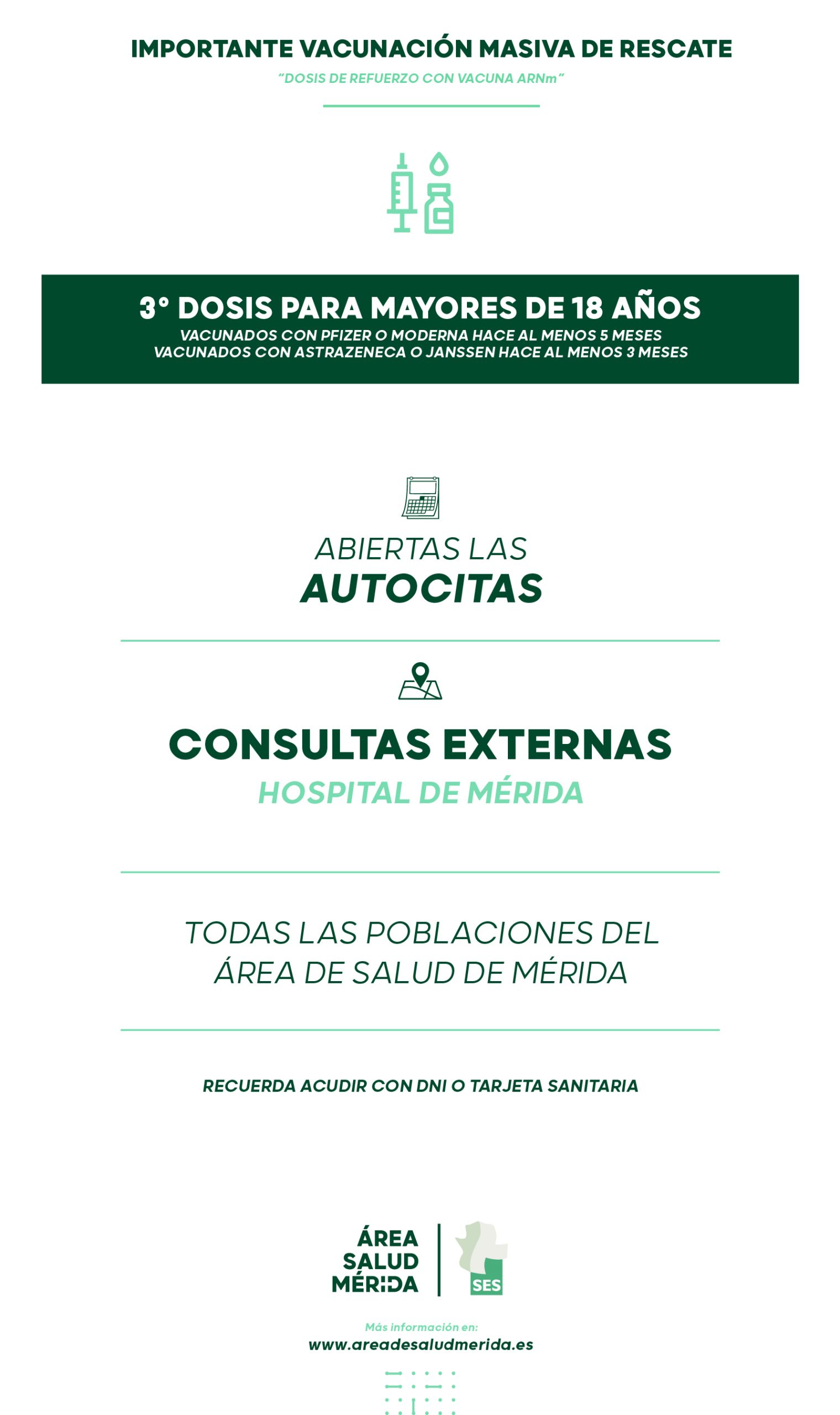 El Área de Salud de Mérida abre la autocita para las vacunaciones de 3ª dosis de los mayores de 18 años en el siguiente enlace: