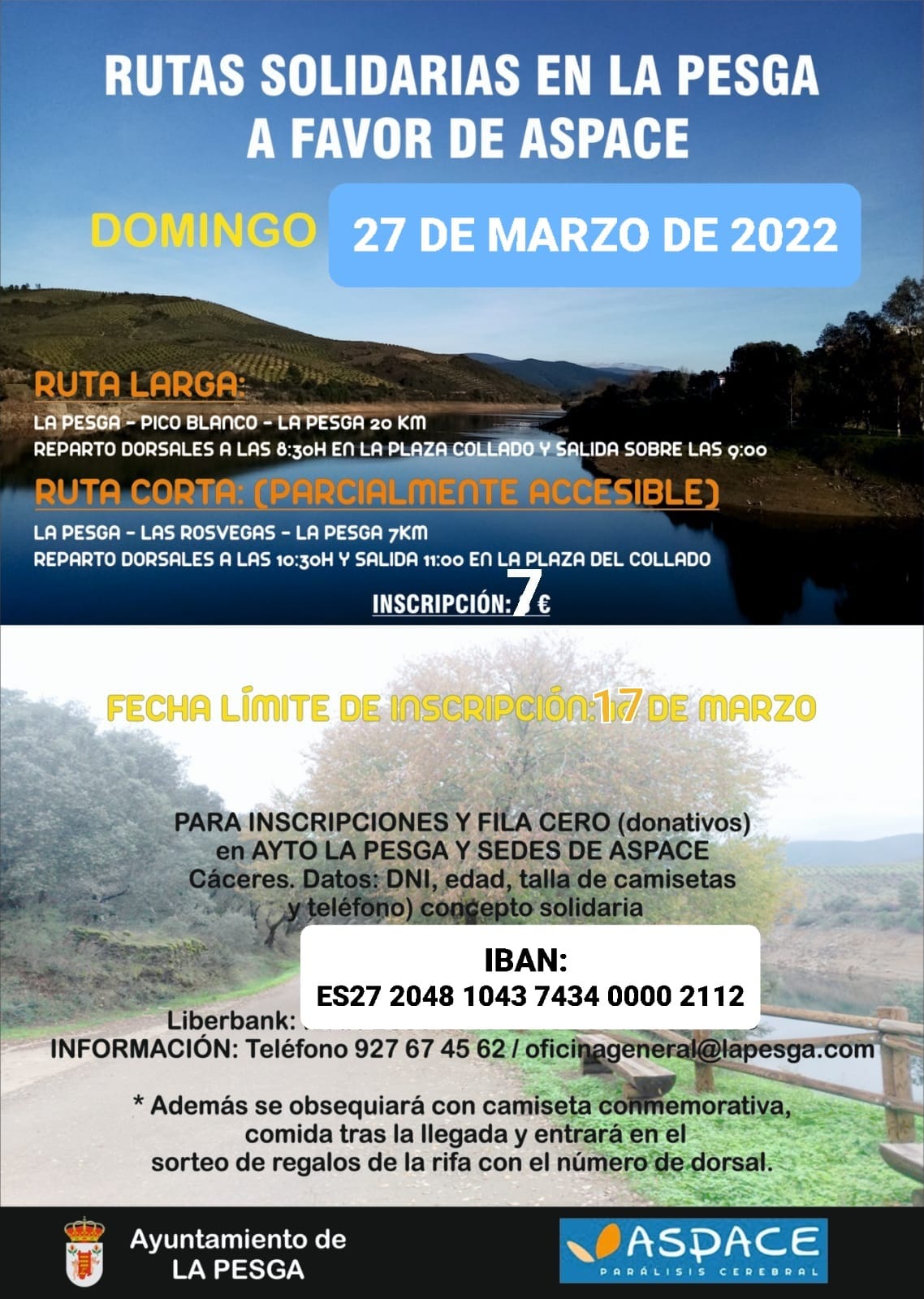 Me complace comunicarles que el día 27 de marzo, tendrá lugar en este municipio de La Pesga una Ruta benéfica para ASPACE.
