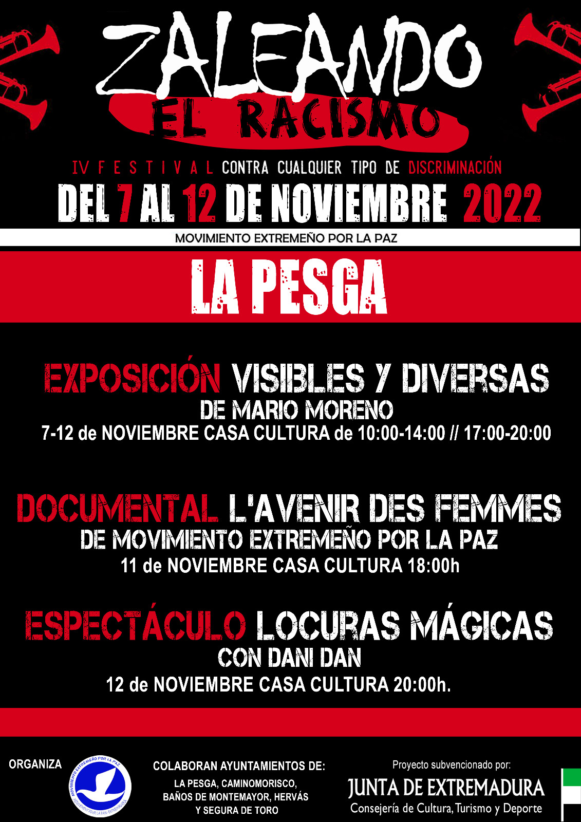 A través de "Movimiento extremeño por la Paz" llega a la Casa de Cultura de La Pesga el Festival Zaleando el Racismo, con una serie de actividades entre los días 7 y 12 de noviembre: