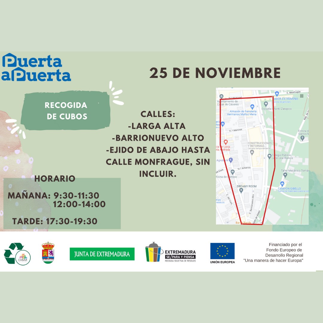 Para la recogida de cubos hoy, 25/11/22, tocan la calle Larga Alta, Barrionuevo Alto, Ejido de Abajo hasta la calle Monfragüe (sin incluir calle Monfragüe).
