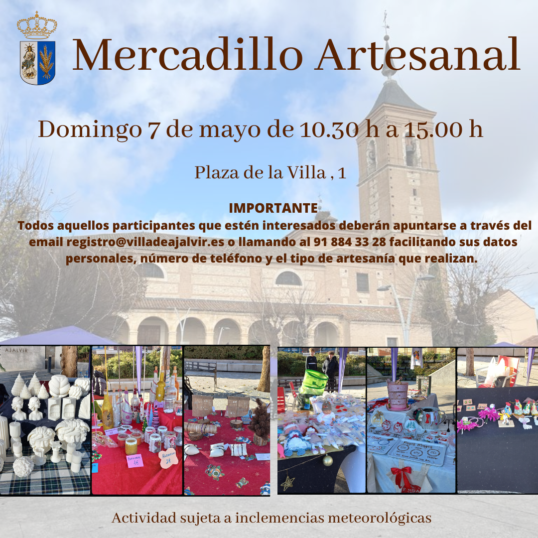 El Ayuntamiento de Ajalvir, ha programado un Mercadillo de Artesanos que se celebrará el próximo 7 de mayo de 10:30 a 15:00 horas en la Plaza de la Villa, para dar mayor visibilidad a la actividad artesanal del municipio.